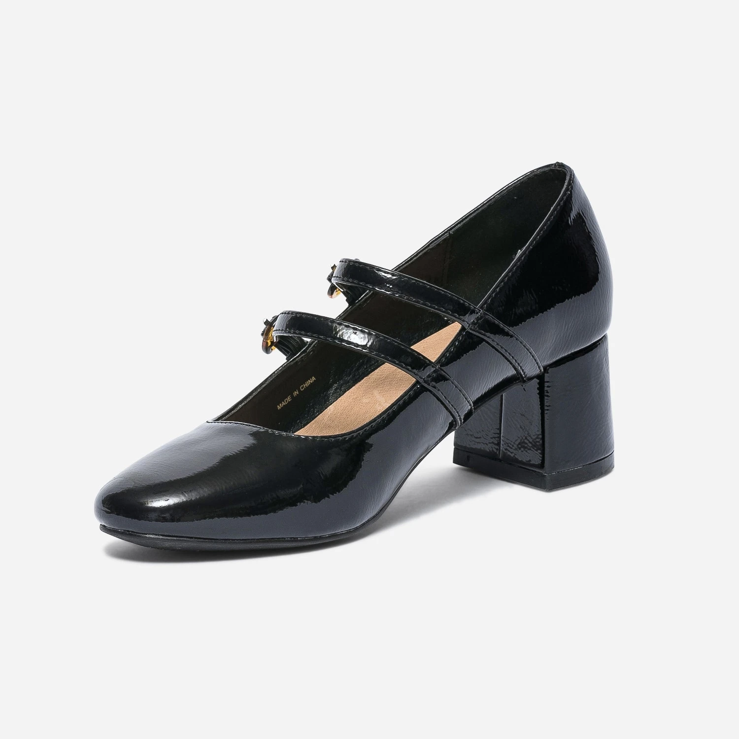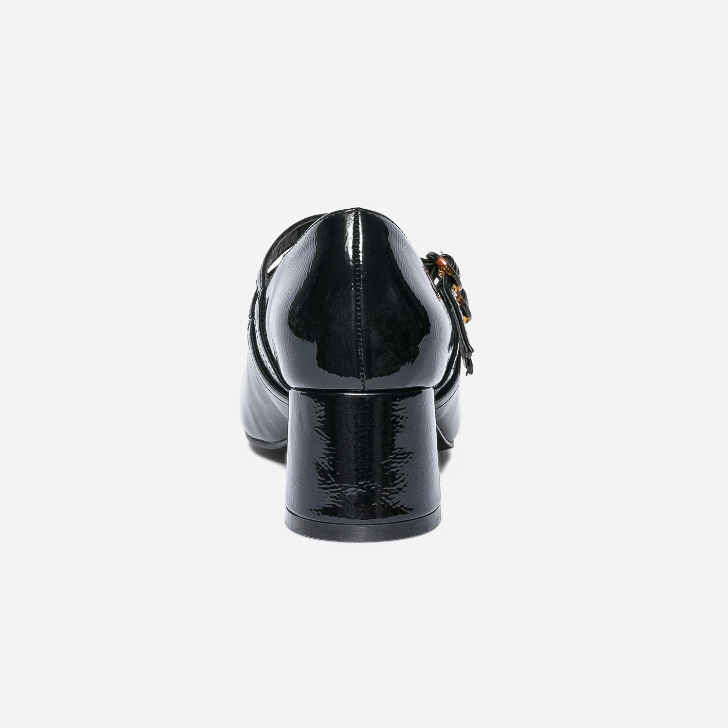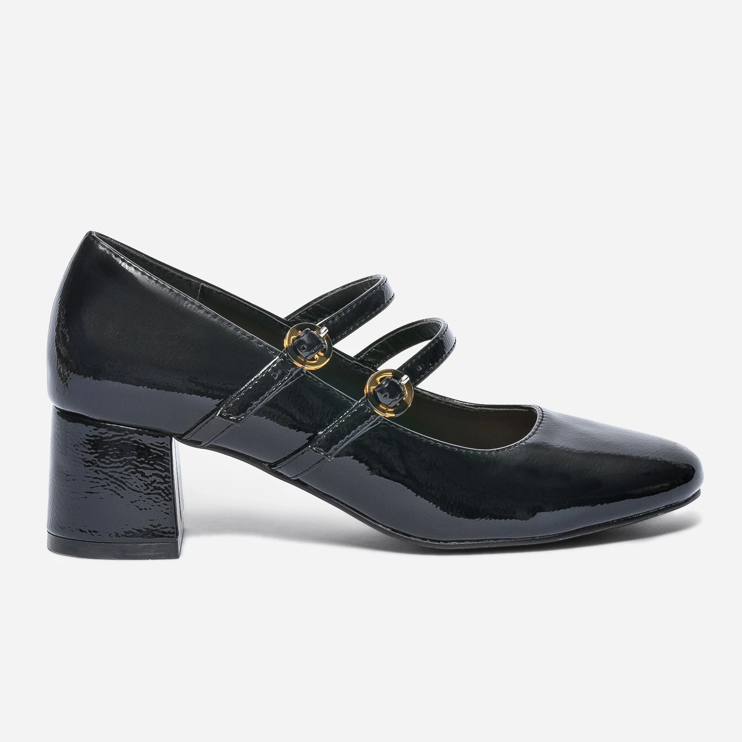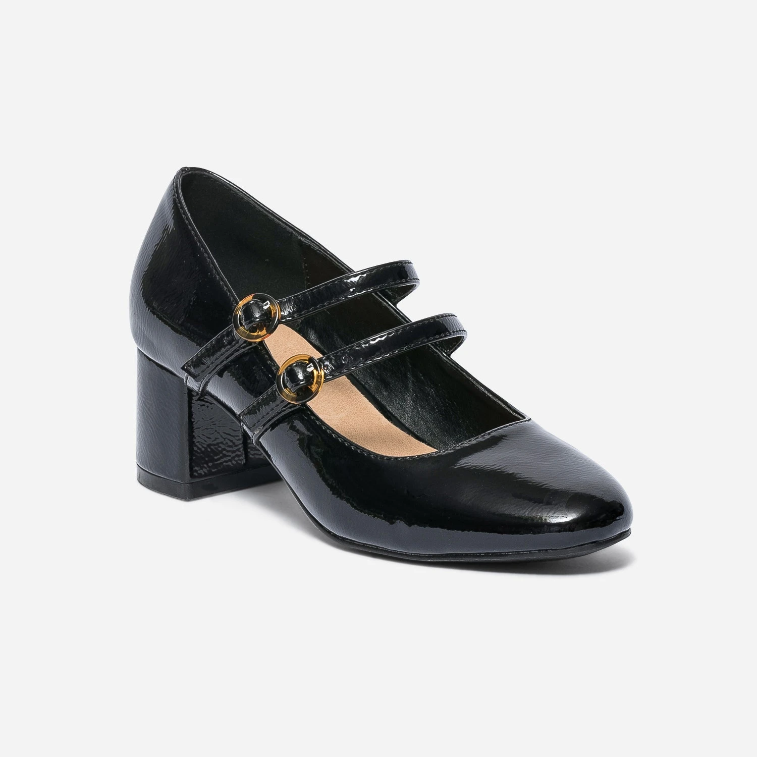 Revenir aux classiques a parfois du bon ! La preuve avec cette babies pour femme. Toute en brillance, elle se décline en coloris noir, avec une finition vernie. Toute en rondeur, elle se ferme par deux brides parallèles avec petites boucles façon écaille. Montée sur un talon de 6,5 cm, elle finalise les looks d’écolière comme les tenues plus rétro.