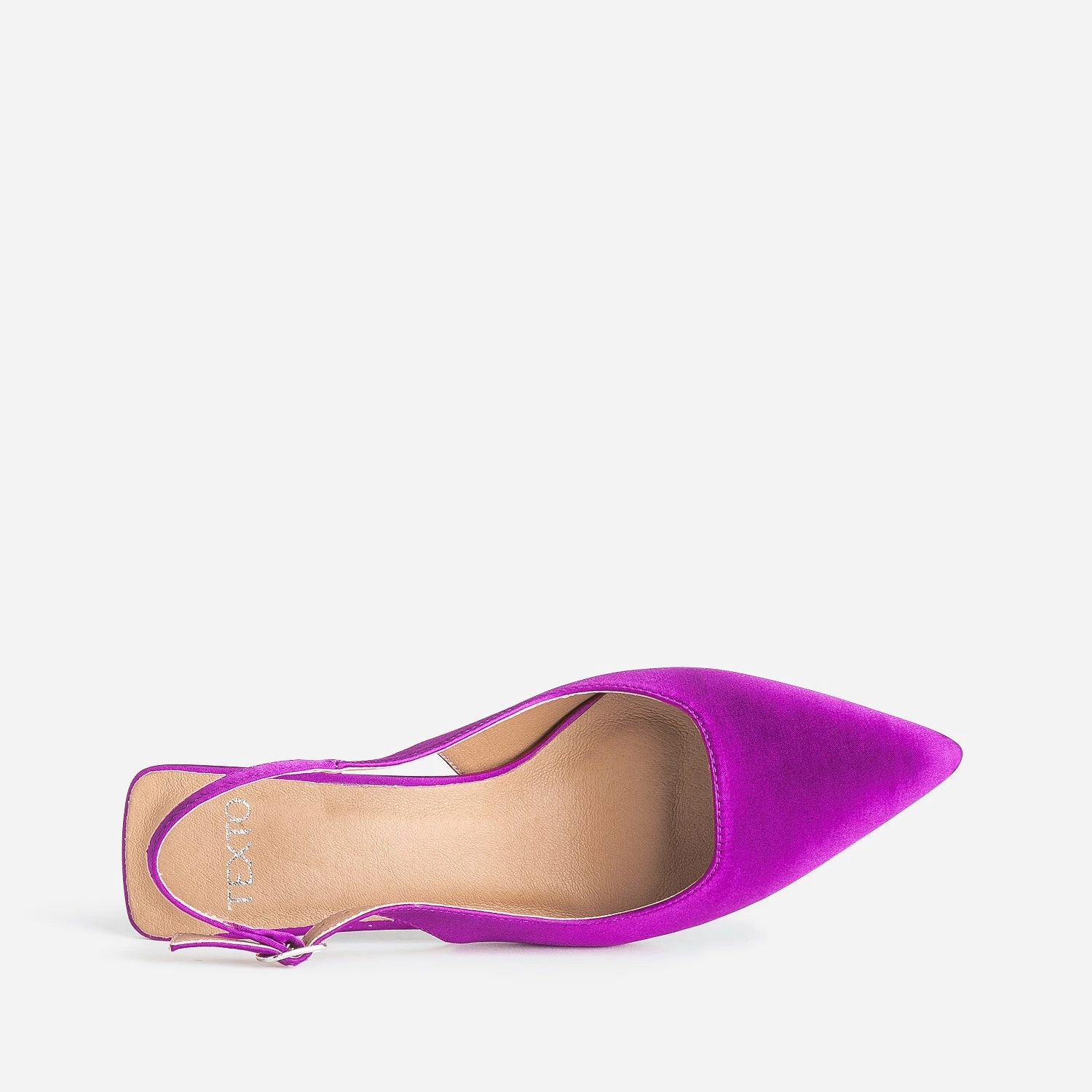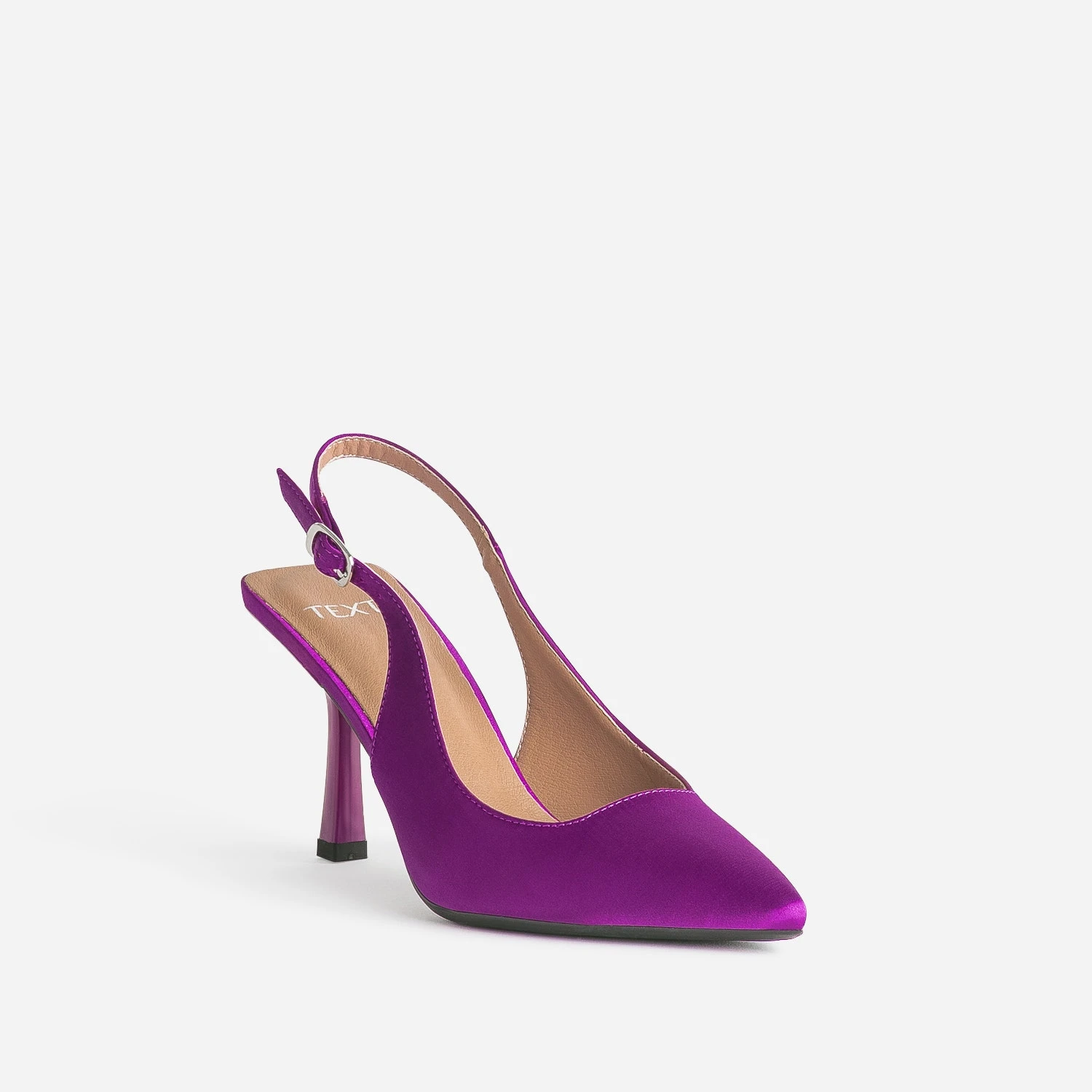Cet escarpin est la définition même du glamour. Forme slingback, due à sa bride sur talon découvert, il est conçu en textile satiné dans un sublime coloris violet. Bout pointu et talon fin de 8 cm, il élance la silhouette avec style et élégance. Privilégiez-le pour une cérémonie, avec une robe légère et imprimée dans les mêmes tonalités, et une pochette assortie.
