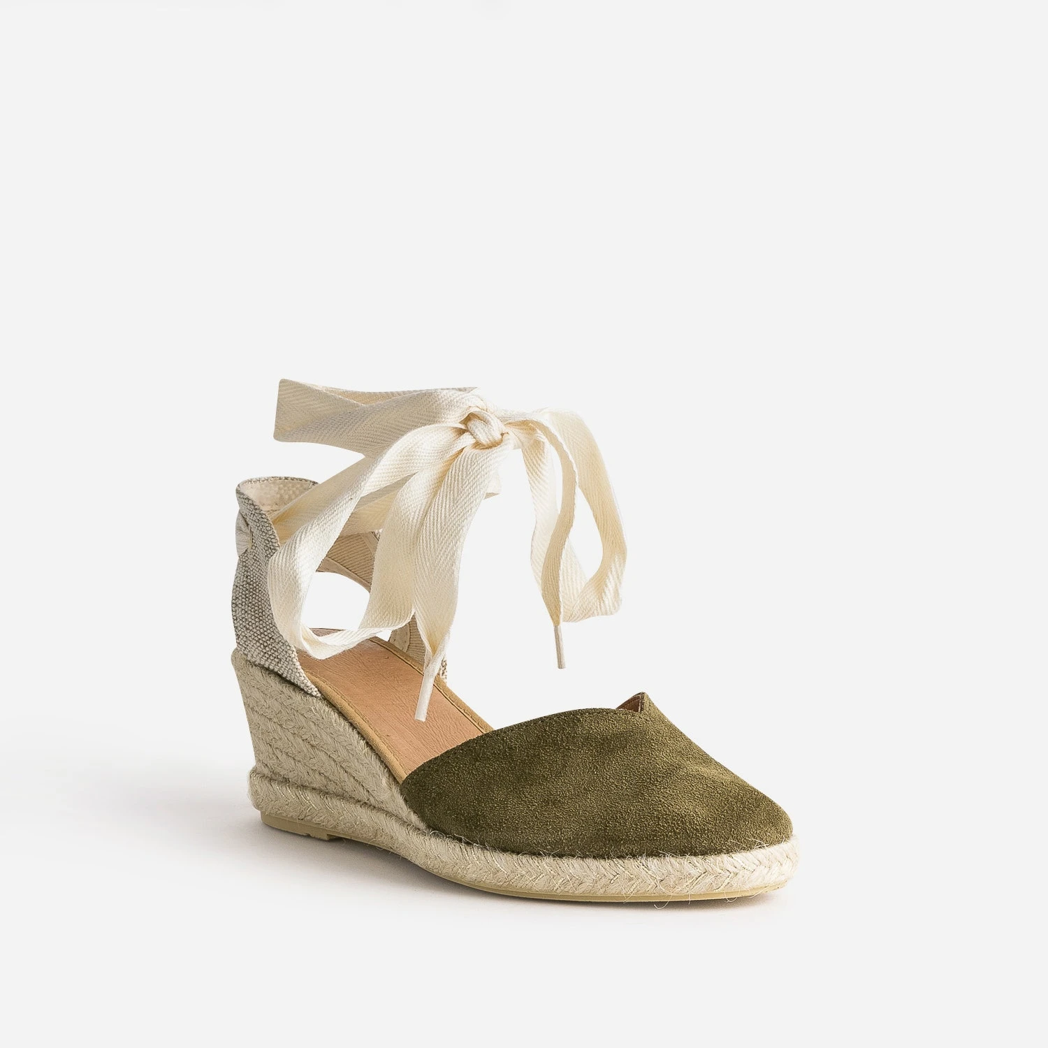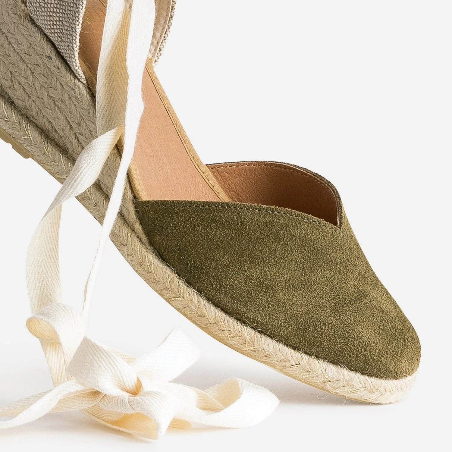 Pour toutes ces journées où il ne fait pas trop beau, où le soleil voudrait s’imposer, l’espadrille compensée est l’incontournable de l’entre-saison. En cuir velours, elle se décline en coloris kaki et se démarque par une découpe cœur sur le décolleté du pied. Elle est montée sur un talon en corde de 6 cm et est maintenue par un lacet, à nouer autour de la cheville. Un modèle à porter au quotidien de préférence avec une robe, une jupe ou un combi-short.