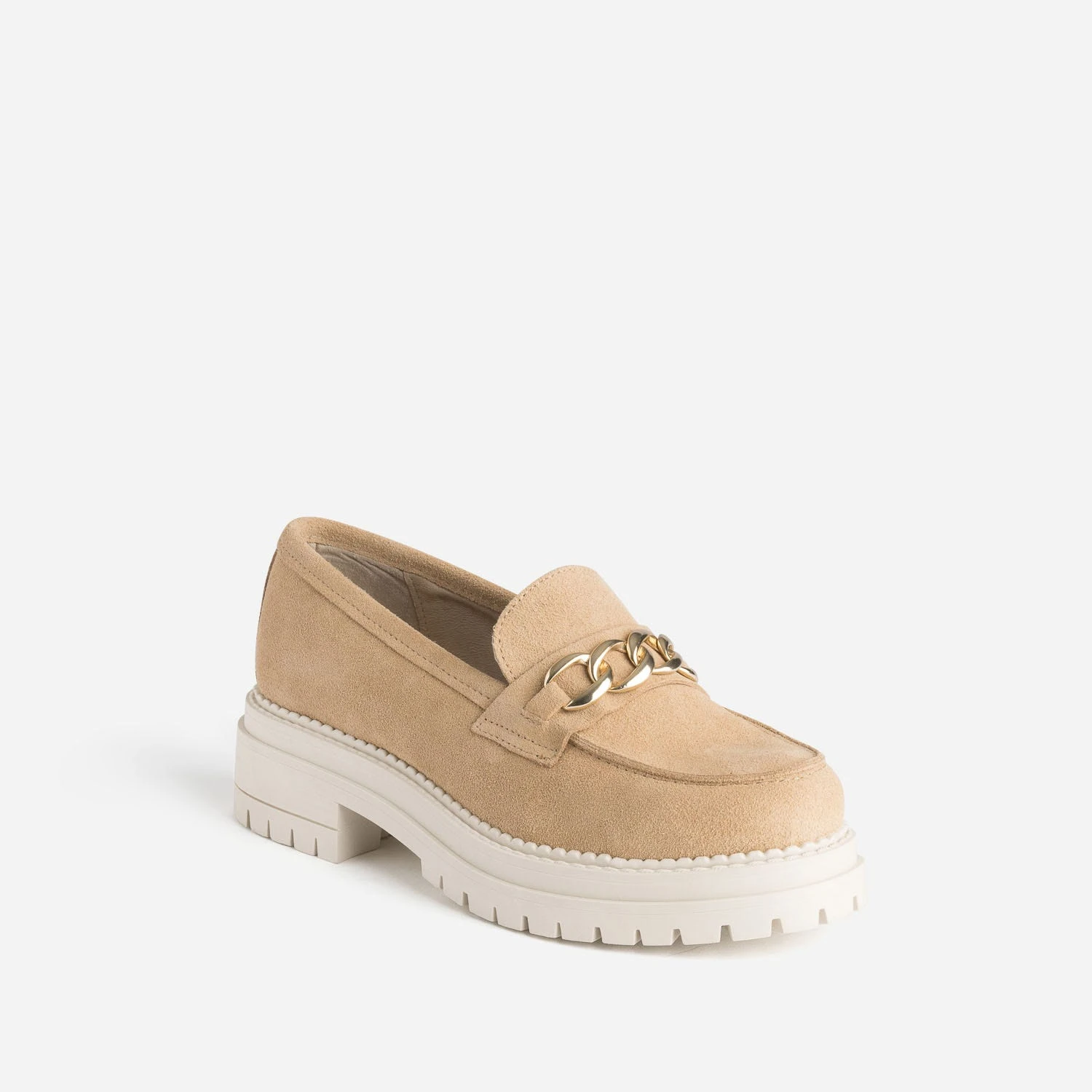 Monté sur une semelle épaisse et crantée, le mocassin s’affranchit des codes traditionnels. En cuir velours beige, il est décoré d’une maxi chaîne en métal doré sur le dessus du pied. Un modèle à jouer avec un costume à carreaux, pour un look masculin/féminin, ou encore avec un sweat ou un bomber, sur un jean, pour un style plus street.