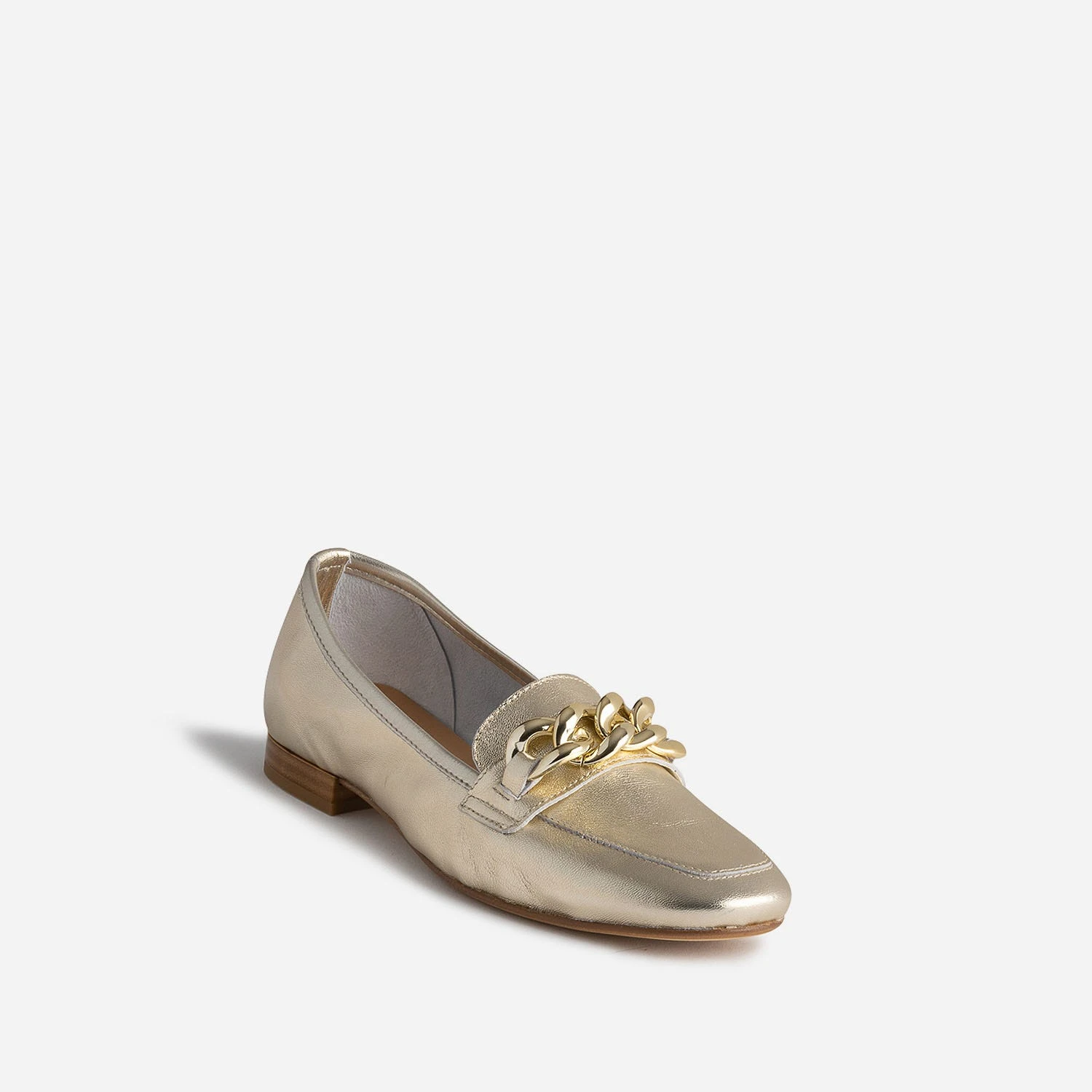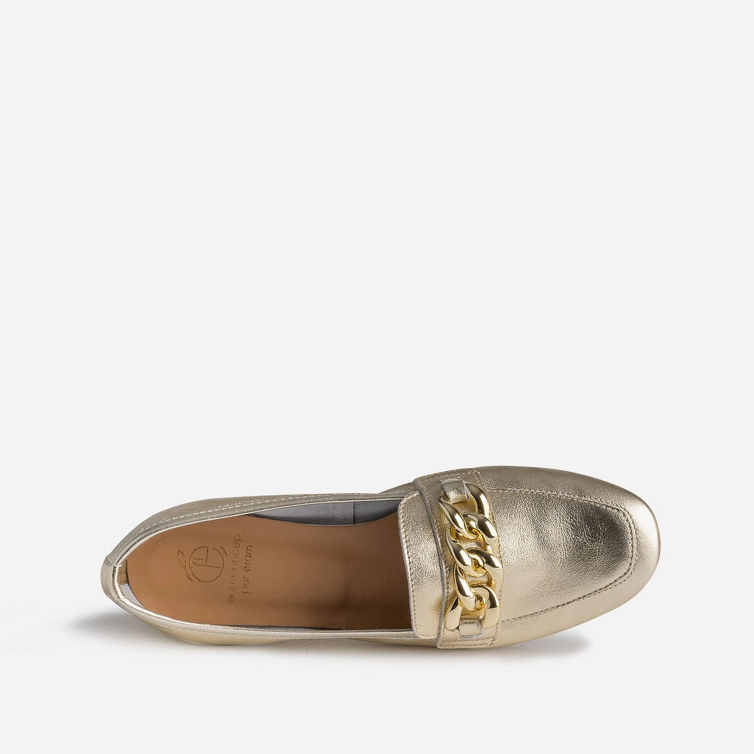 C’est une certitude : le mocassin pour femme est toujours à la pointe des tendance mode de la saison. En cuir lisse et métallisé, il est non doublé, pour profiter d’une vraie souplesse, et se décline dans un sublime coloris doré, d’une élégance toujours surprenante. Sur le dessus, une maxi chaîne en métal doré apporte une touche bc-bg, à assumer avec une veste de costume bleu marine et un slim brut ou à décaler avec un look monochrome pastel.