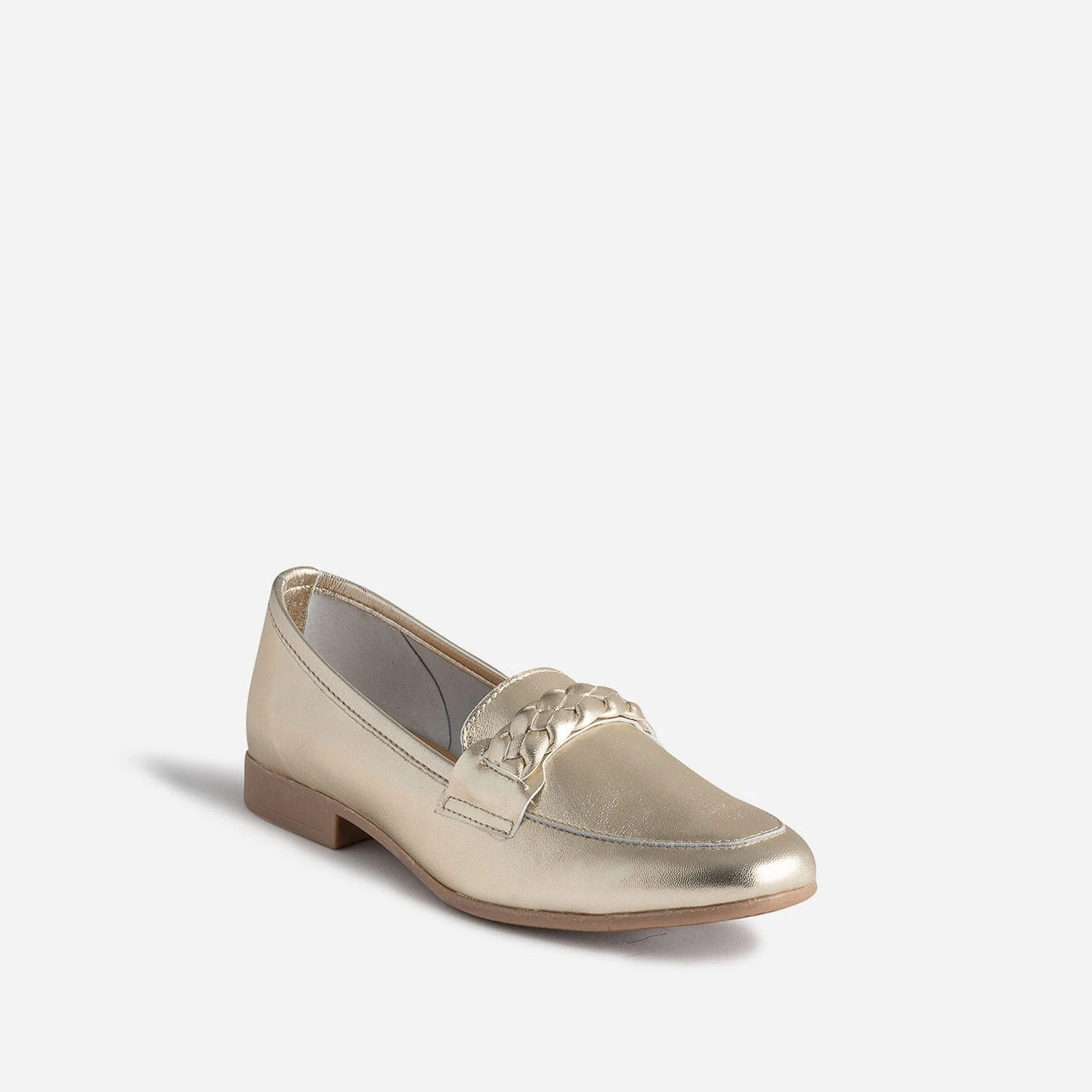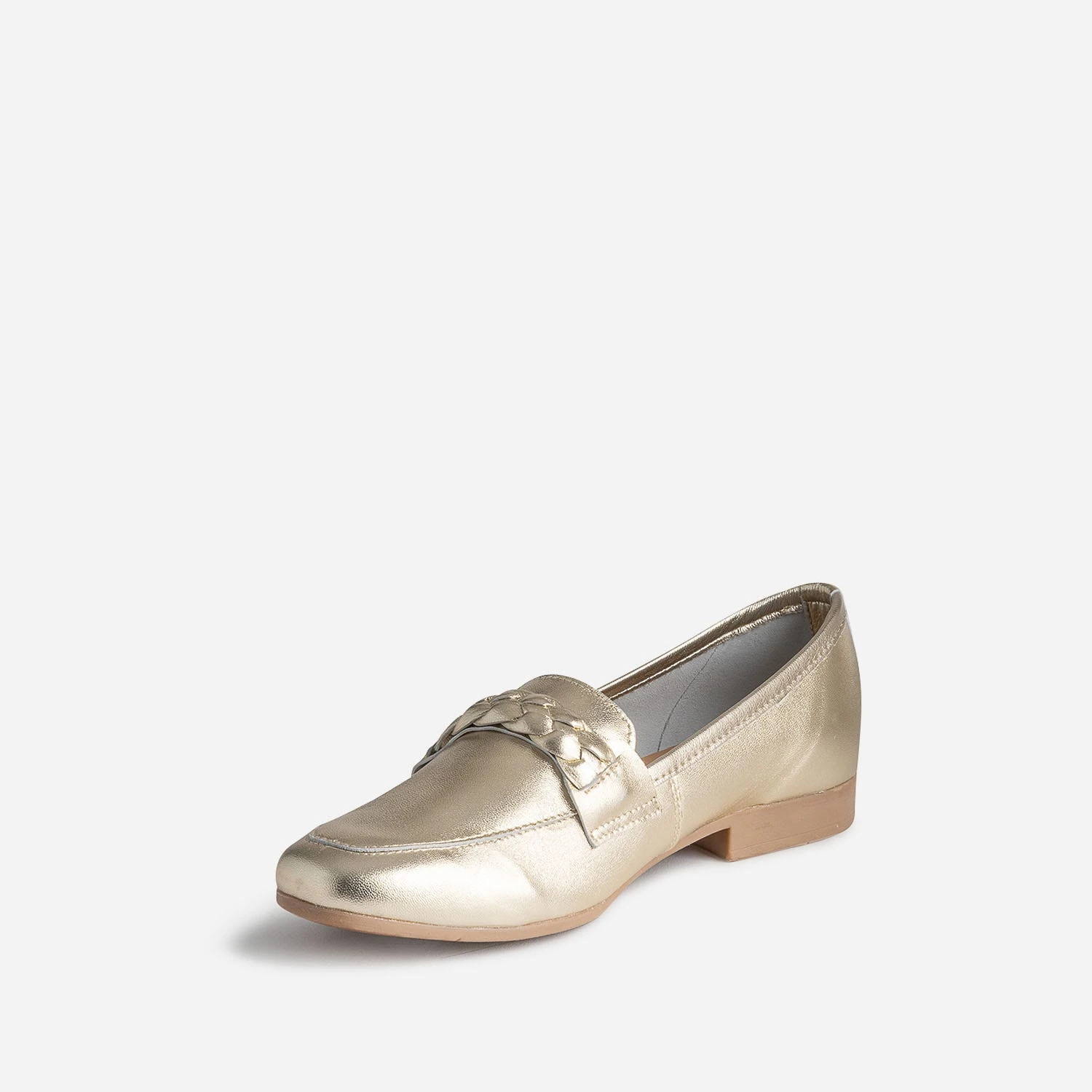 Saison après saison, le mocassin s’impose dans le shoesing, par son élégance et sa facilité d’adaptabilité. En cuir lisse métallisé doré, il est non doublé pour profiter d’une belle souplesse, et la découpe masque traditionnelle est remplacée par une patte tressée ton sur ton. Avec un costume noir ou pastel, ou avec une chemise blanche et un jean brut, laissez-vous surprendre.