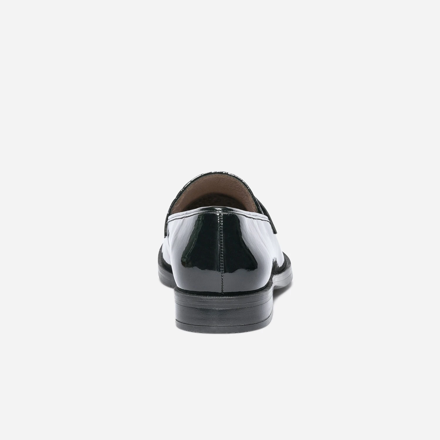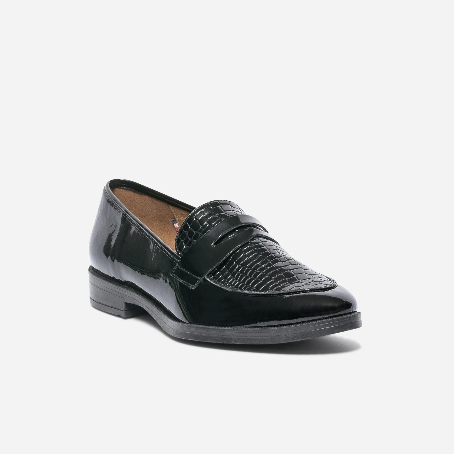 Classique et intemporel, le mocassin intègre le shoesing des femmes modernes et actives. En cuir ultra souple, il se décline en coloris noir, avec finition vernie et embossage croco sur le dessus du pied ; il présente une découpe masque spécifique sur le dessus du pied. La semelle amovible intérieure est reconnue pour ses propriétés d’amorti, de respirabilité et de durabilité. Un modèle à privilégier avec un look masculin/féminin, costume et chaussettes à paillettes, chemise blanche et jean boyfriend, tout au long de la saison.