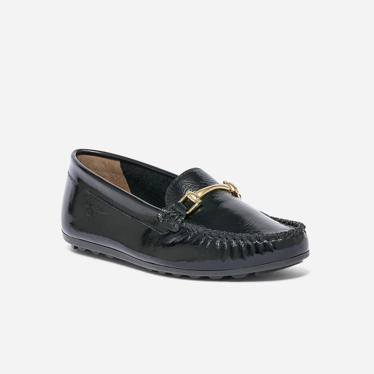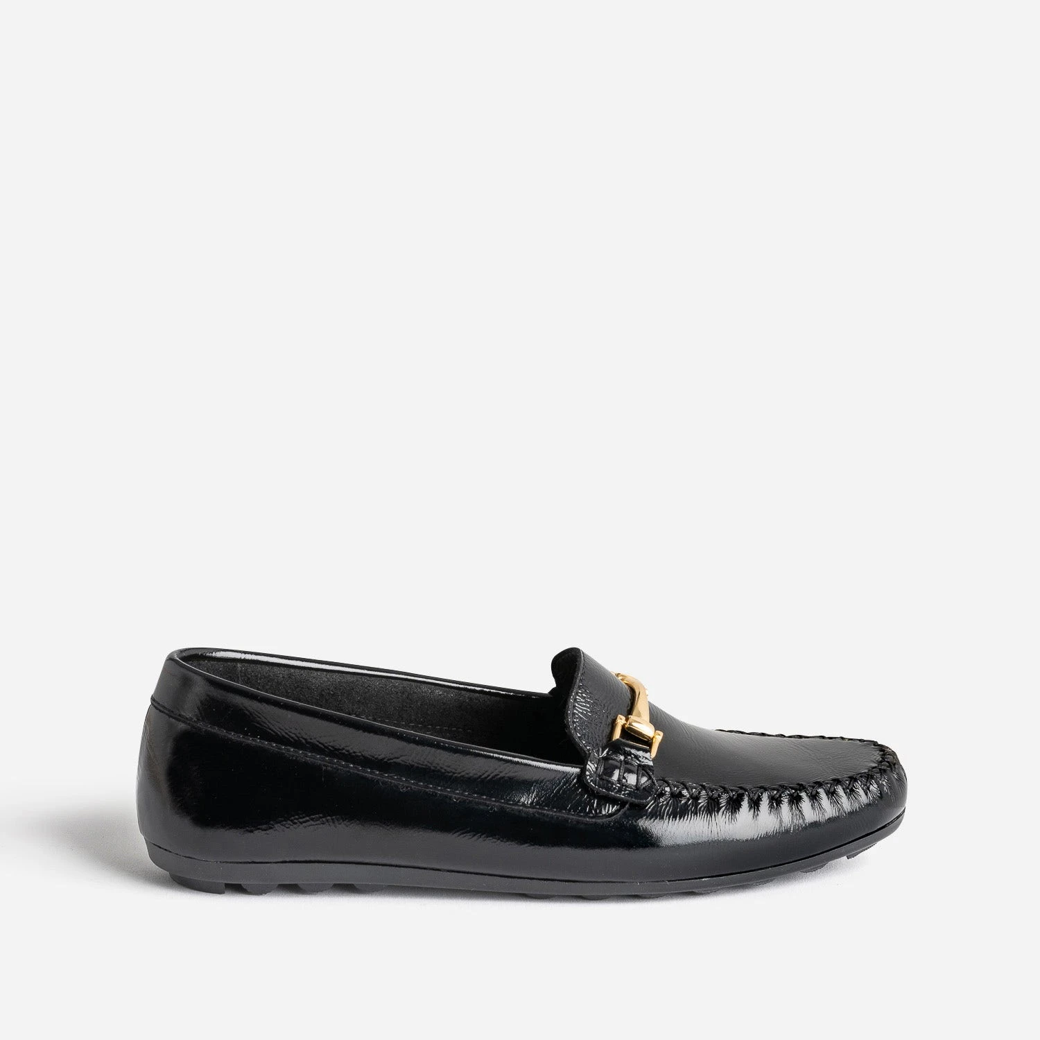 Le mocassin est idéal pour gérer l’entre-saison en douceur. Il se porte impérativement nu-pieds pour profiter de la souplesse et du confort du cuir. Coloris noir, il accueille une finition vernie très chic, souligné d’un mors doré. Un modèle à privilégier avec des pièces unies dans les tons neutres.