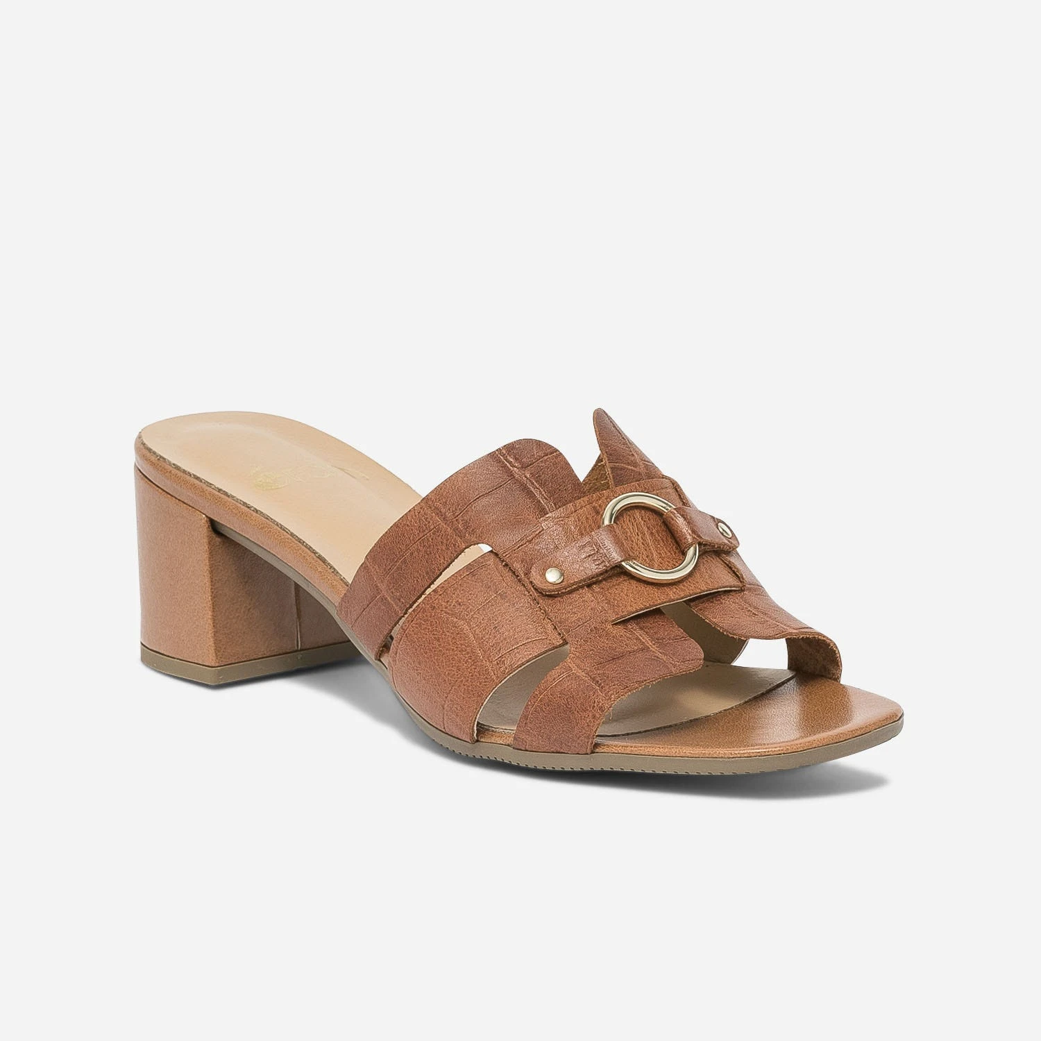 Avec sa large brique unique, cette mule assume son pouvoir mode de saisons en saisons. En cuir cognac embossé croco, non doublé avec première synthétique, elle présente un anneau en métal doré sur le dessus. Le petit talon de 5,5 cm permet de trotter toute la journée, sans avoir mal aux pieds. Un modèle si facile à porter, que vous ne pourrez plus vous en passer !