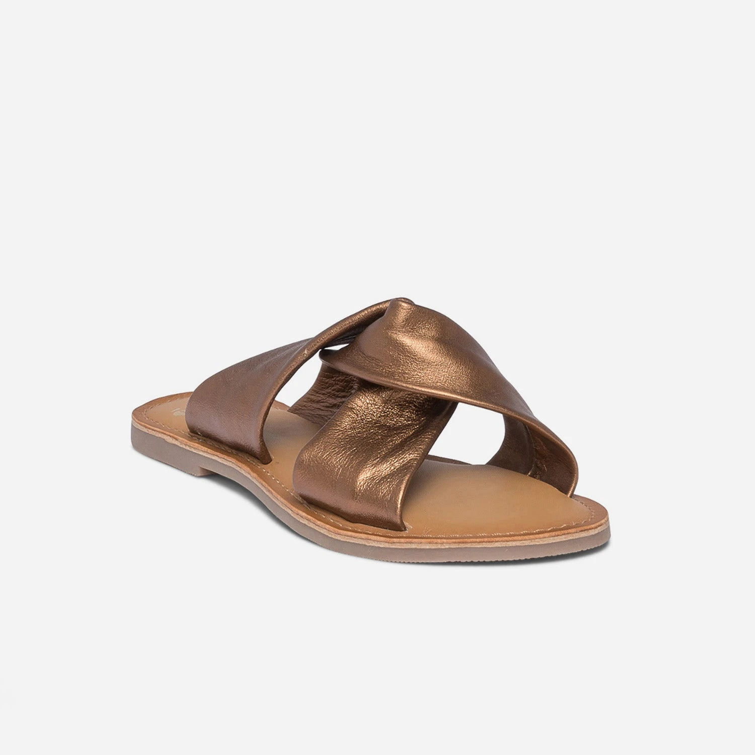 Plus minimaliste que ça ? ça n’existe pas ! Cette mule femme est entièrement confectionnée en cuir, depuis ses larges brides souples croisées sur le dessus du pied, jusqu’à la première. Bronze, elle est l’alliée idéale des looks du quotidien. Un modèle à porter avec un tee-shirt à épaulettes et un pantalon large en total look marron foncé.