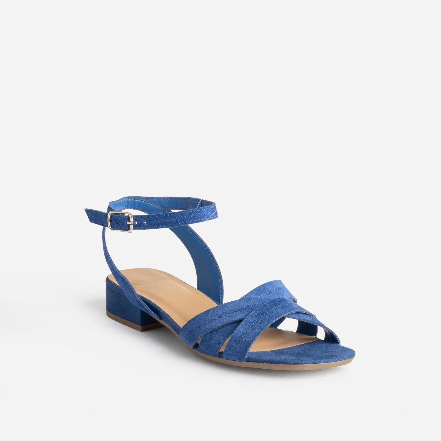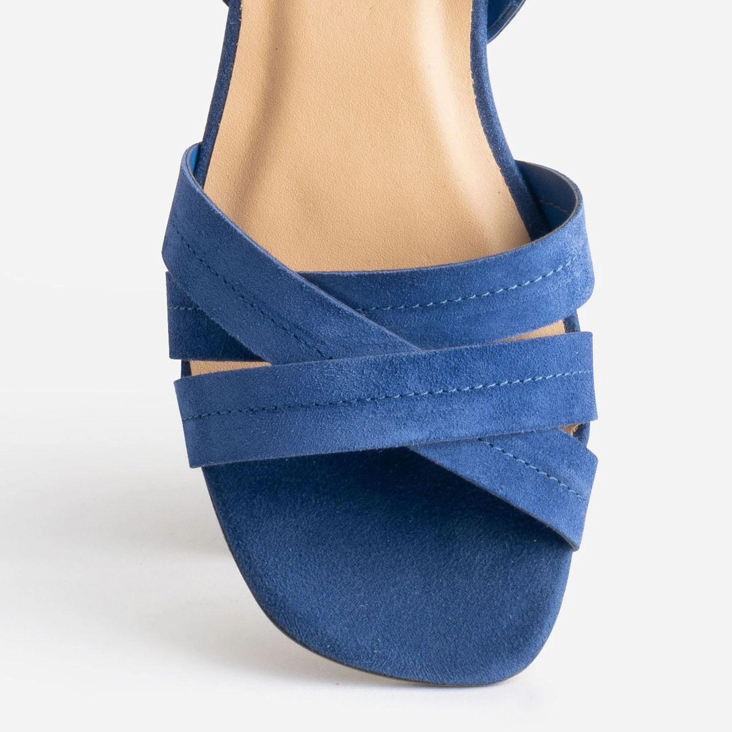 Une sandale qui fait écho à la couleur du ciel, même derrière les nuages, à celle de la mer et à celle des volets des maisons dans les îles… Une sandale qui célèbre l’été, par un cuir velours bleu électrique lumineux. Triple bride croisée sur le dessus du pied, bride autour de la cheville, petit talon décroché recouvert, elle s’accorde avec le bleu clair et le bleu marine, avec le lilas et le prune.