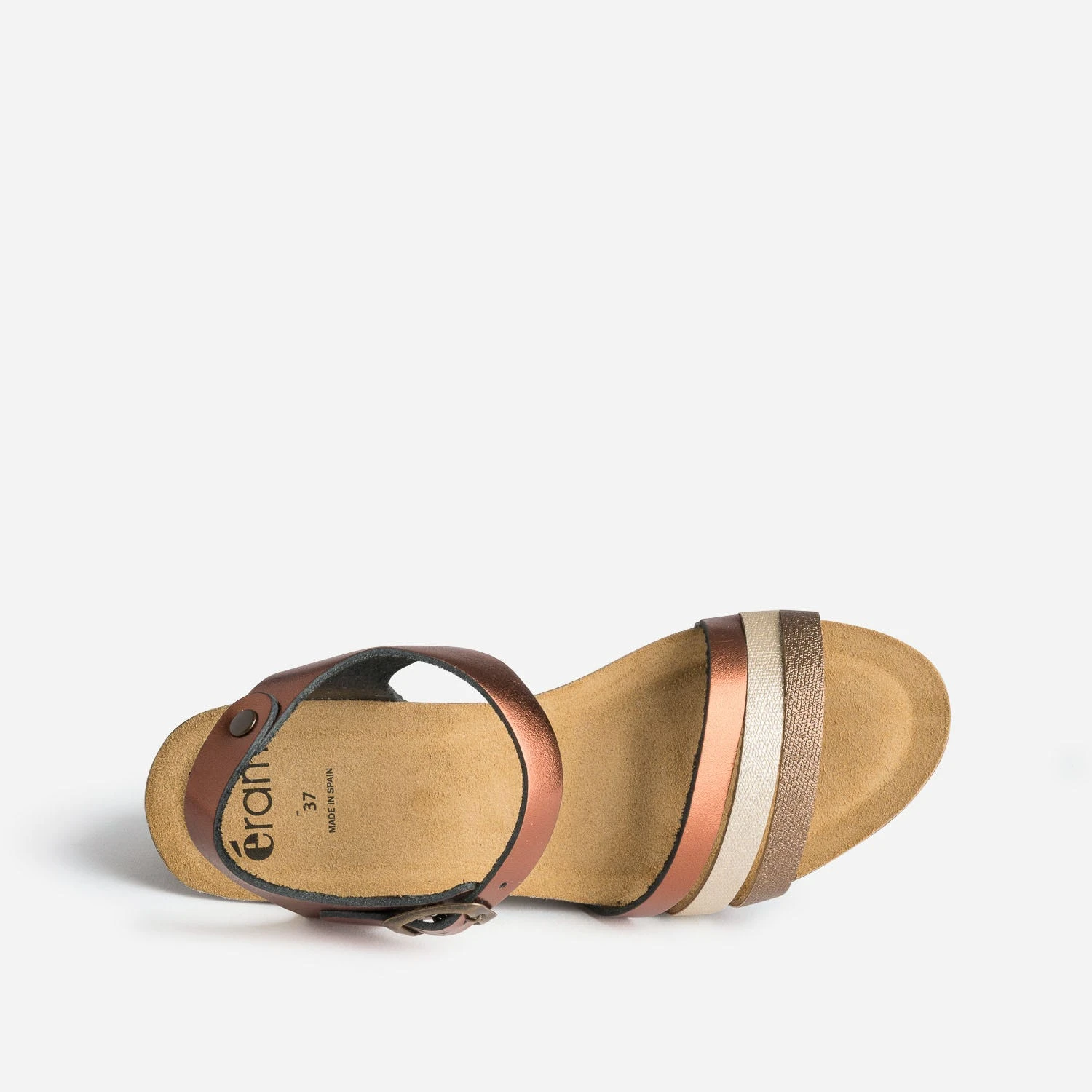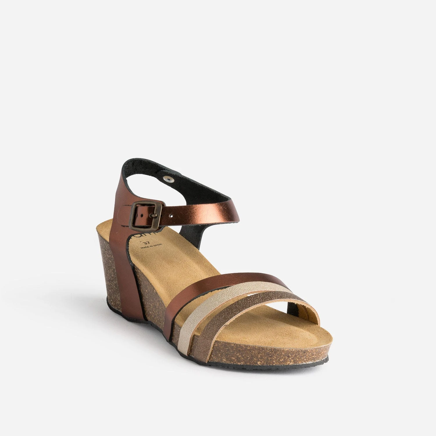 Marron et doré, avec finition métallisée, c’est le duo choisi par les brides en cuir de cette sandale compensée. Son confort est reconnu par sa semelle anatomique en cuir velours. Essayez-la avec des tons plutôt naturels.