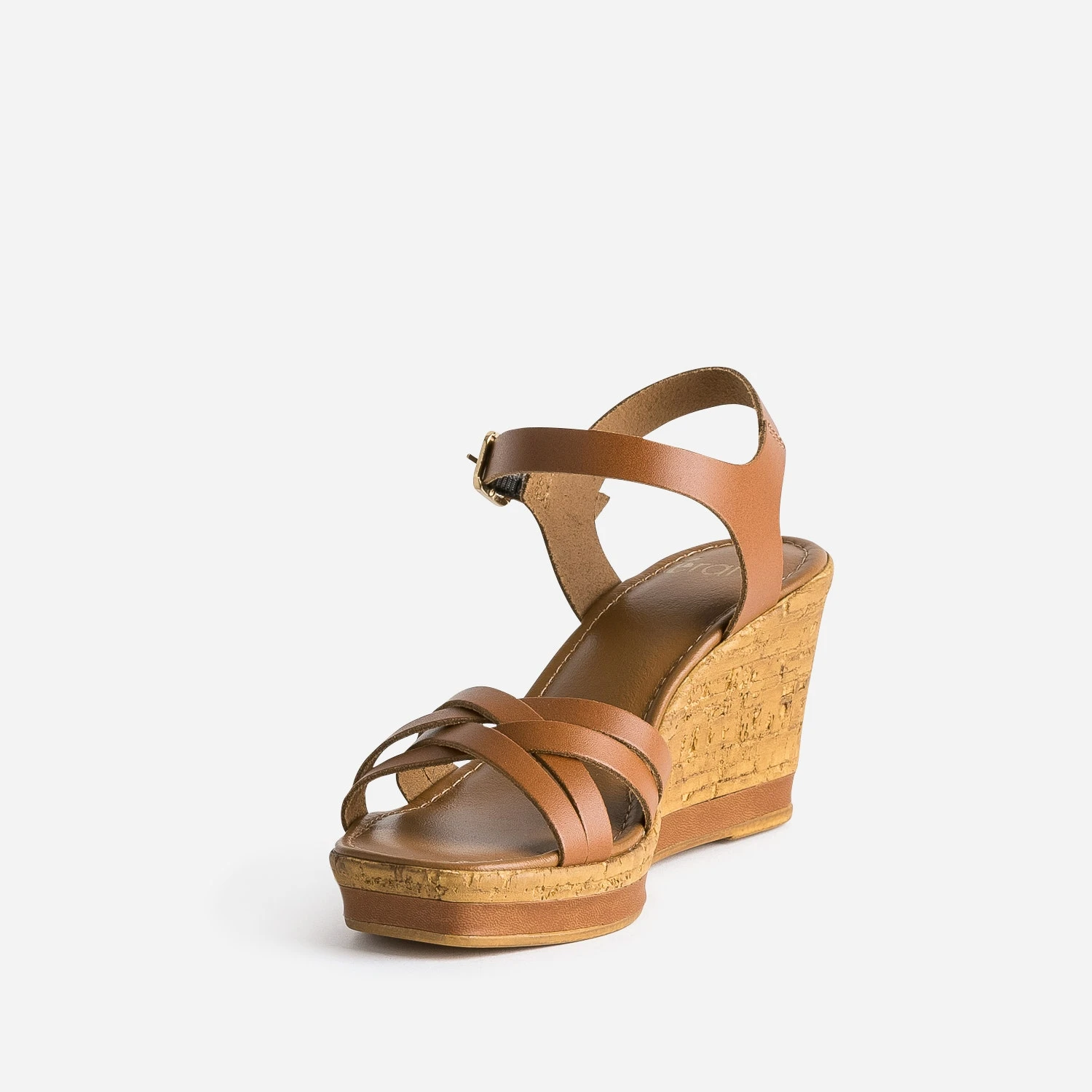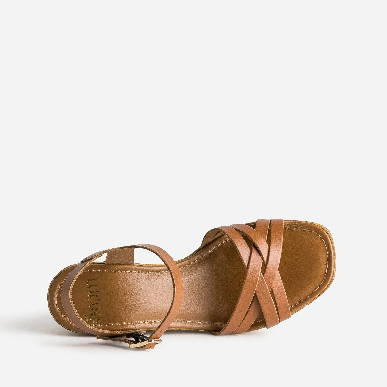 Parmi nos basiques, la sandale compensée s’offre le podium. En cuir camel, elle présente deux doubles brides croisées sur le dessus du pied et est montée sur une semelle imitation liège de 8 cm. Un modèle du quotidien, avec une tenue sobre et décontractée.