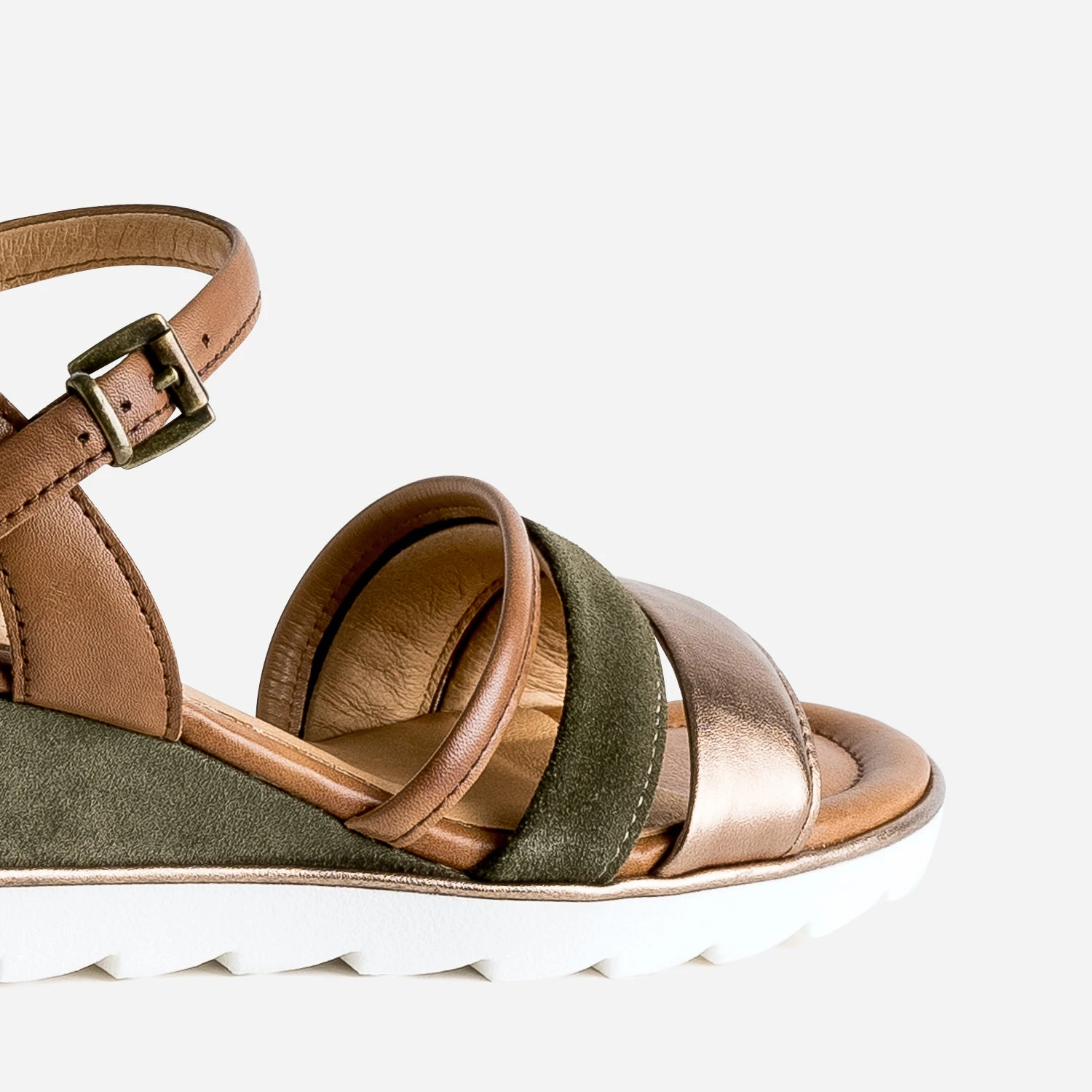 La marque MARCO TOZZI réinterprète les tendances mode avec son propre style. Son maître-mot : le confort, reconnaissable à sa première moussée en cuir, à son talon compensé, à ses brides légèrement matelassées. En cuir velours kaki, elle est twistée d’une ligne bronze sur l’une des brides et la trépointe. Un modèle sobre et élégant, à porter dès l’arrivée des beaux jours.