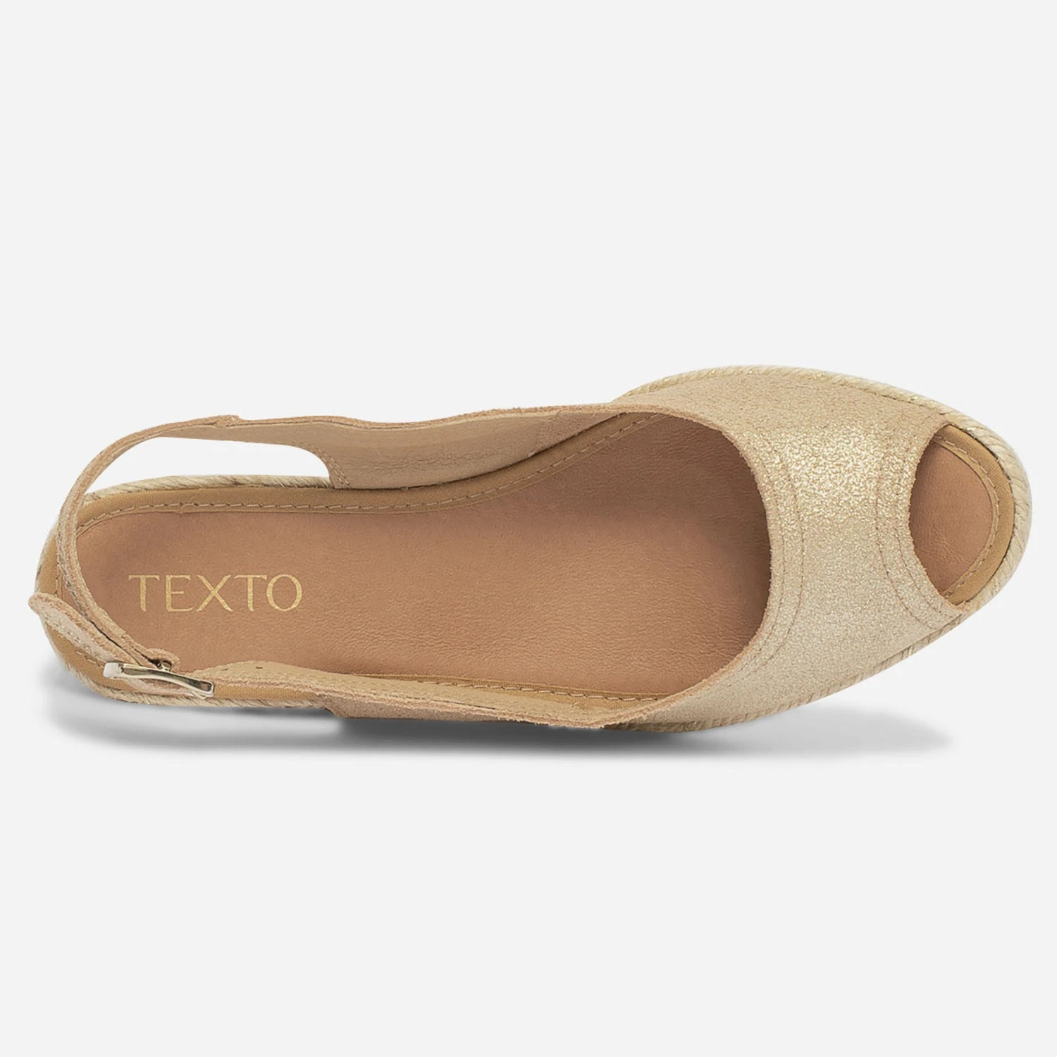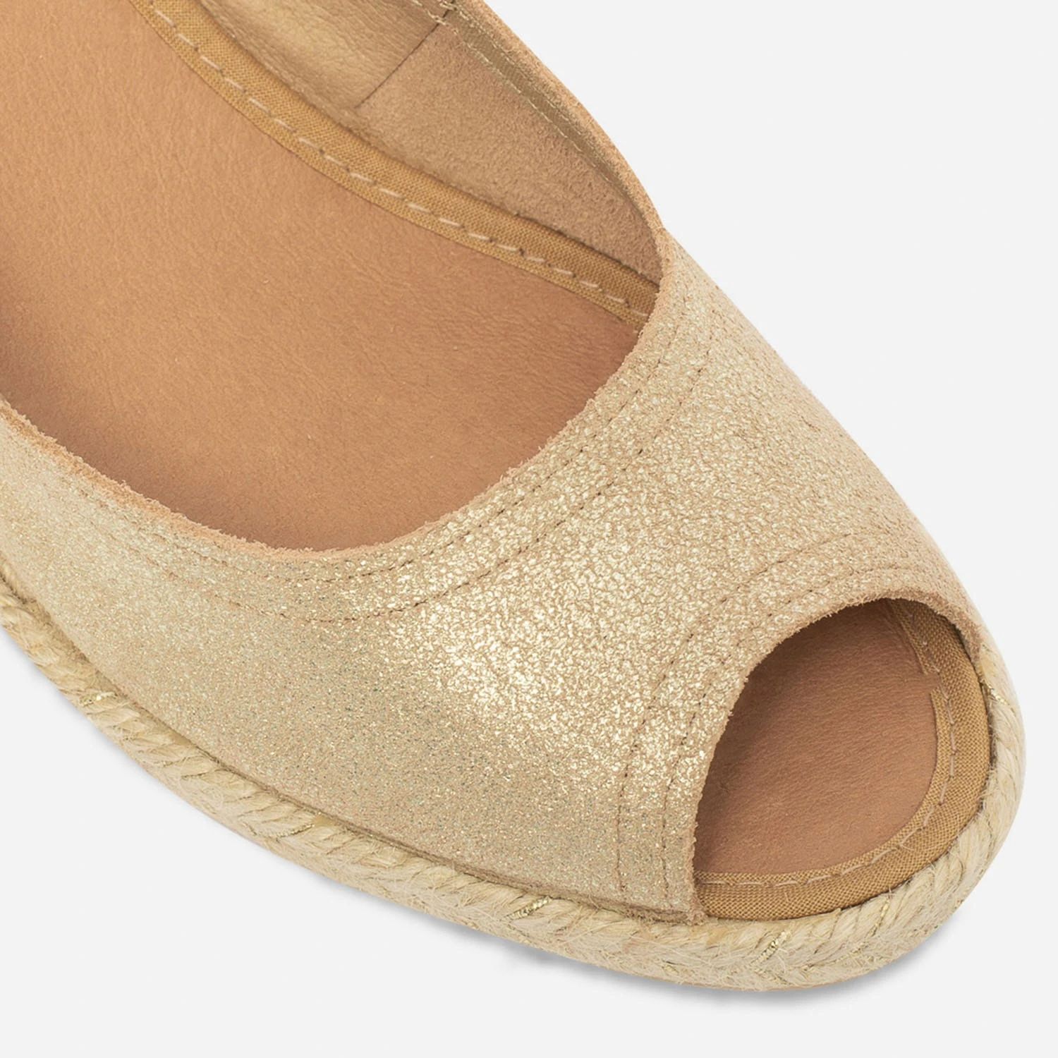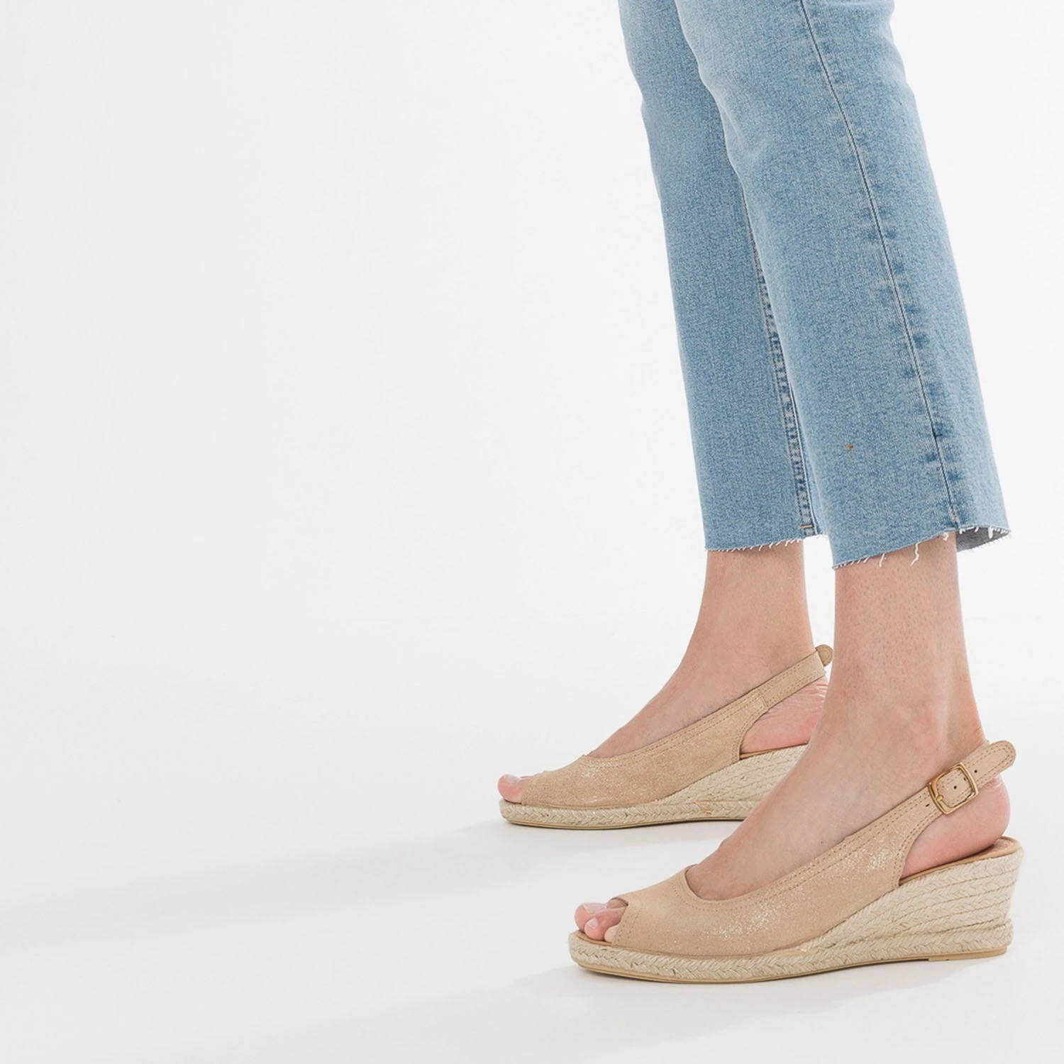 La sandale compensée est l’alliée des looks bohèmes de l’été. Montée sur une semelle compensée recouverte de corde, elle s’autorise une découpe open-toe sur les orteils et une bride à boucle sur la cheville. En cuir velours irisé, elle se décline en coloris or, d’un chic évident. Robe, jupon long ou combinaison, elle matche avec toutes les tenues de la saison.