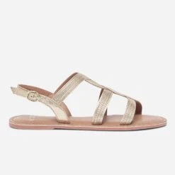 Pour mettre vos pieds en valeur tout l’été ? Misez sur le doré ! Une teinte métallisée idéale pour sublimer la peau hâlée, s’accorder avec toutes les couleurs et finaliser la tenue d’une touche chic. Cette sandale plate pour femme concentre ses atouts sur les brides : fines mais multiples, elle sont confectionnées pour former de subtils entrelacs, qui viennent habiller le dessus du pied. Un modèle d’inspiration ethnique, à essayer avec une robe longue et des bijoux assortis.