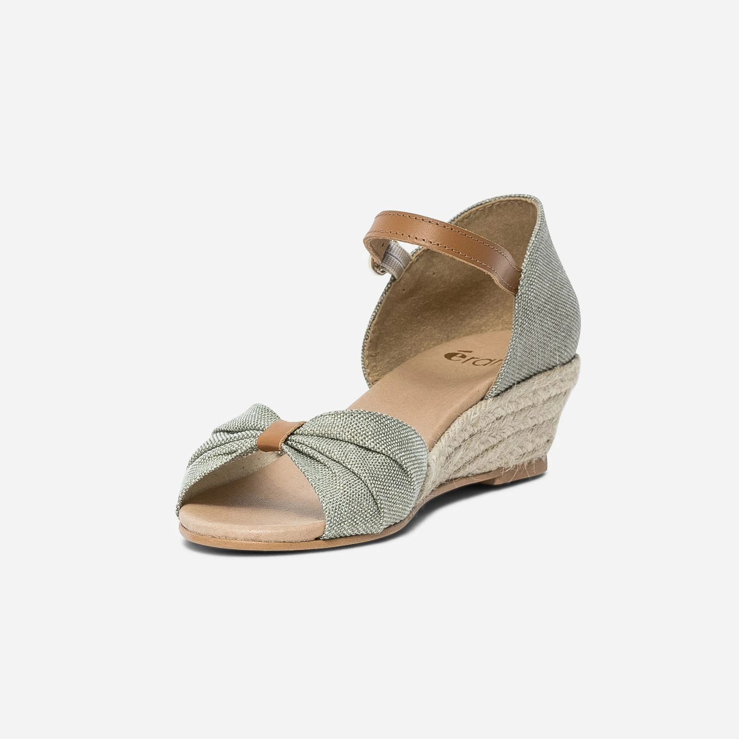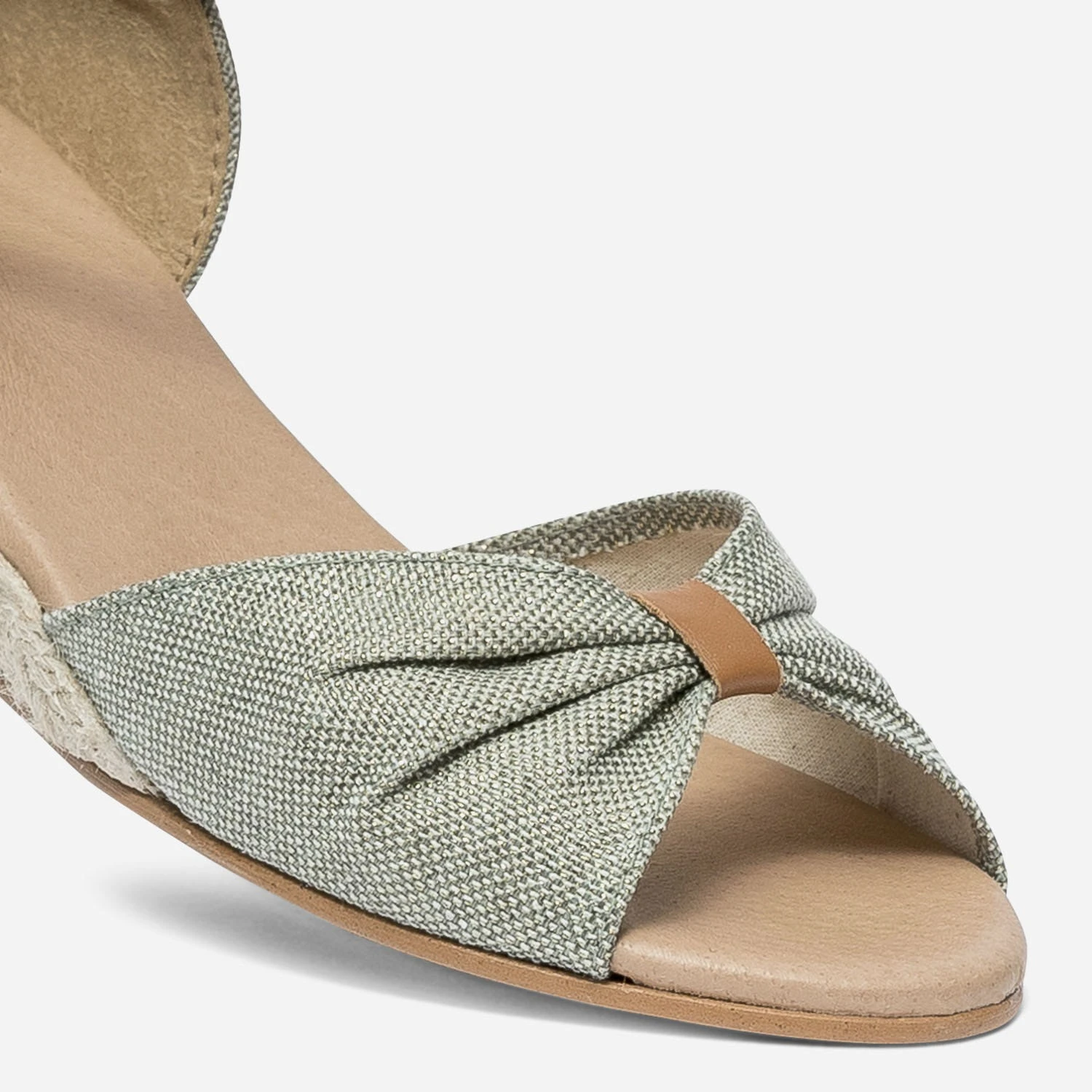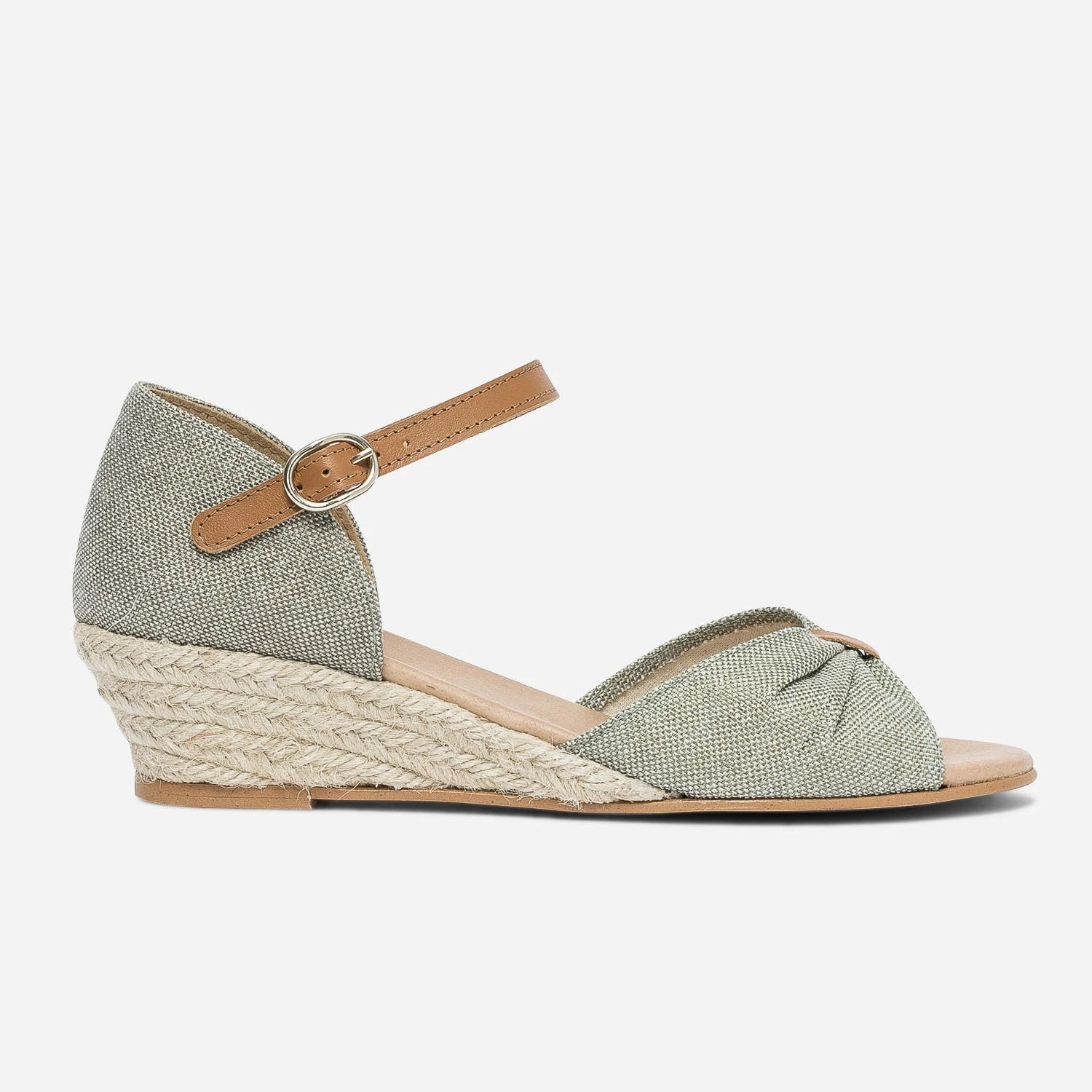 Cette jolie sandale est pensée pour féminiser les jolies tenues estivales ! La toile vert sauge twistée de touches pailletées dorées est montée sur un petit talon compensé en corde de 4 cm. Le bout ouvert dévoile les orteils avec subtilité. Un modèle à collectionner dans toutes les couleurs, version unies ou imprimées.