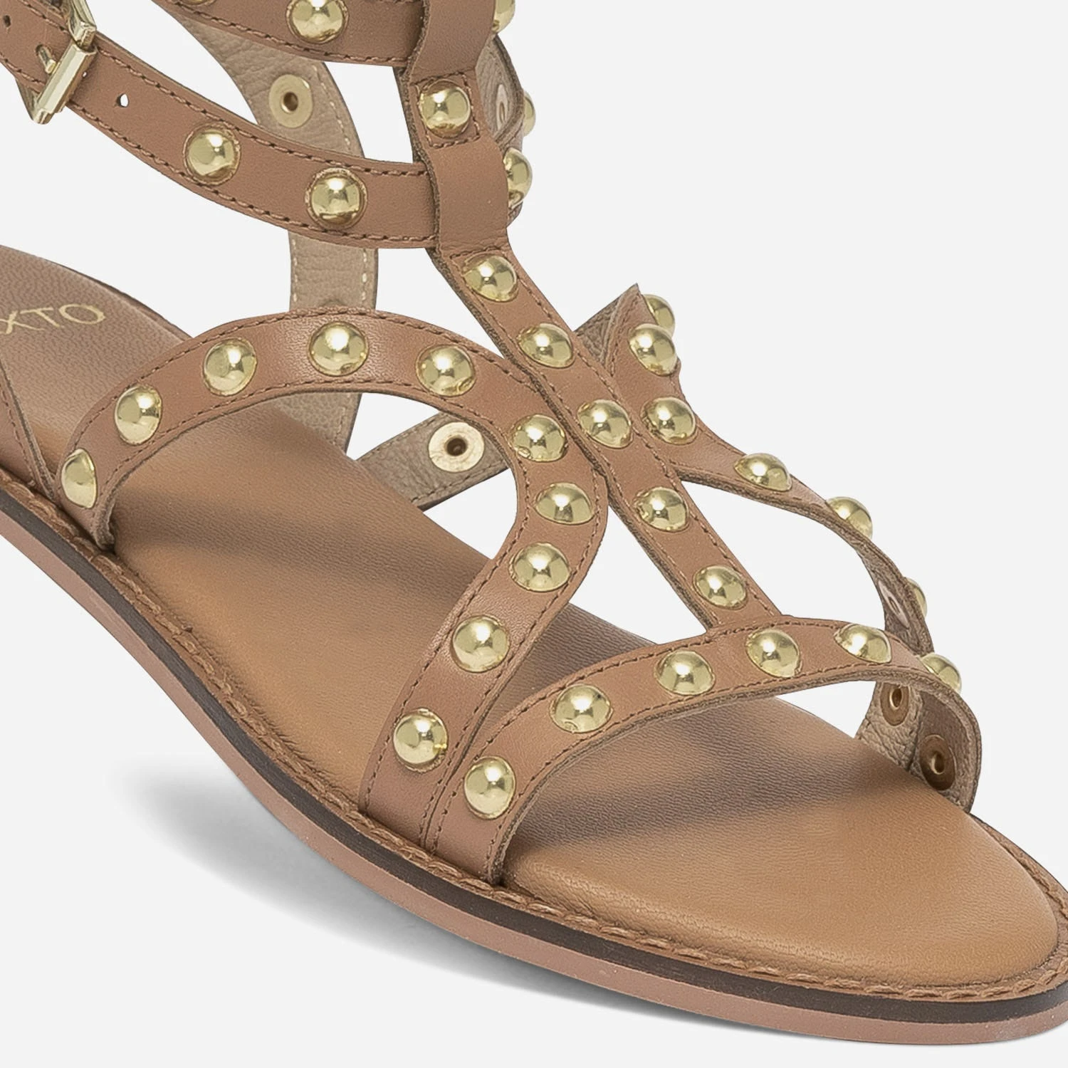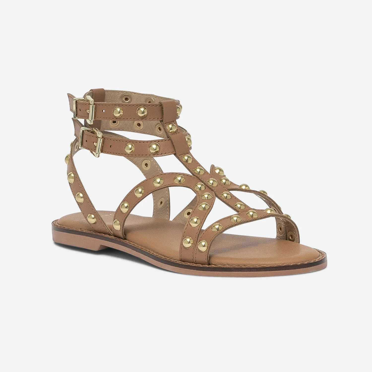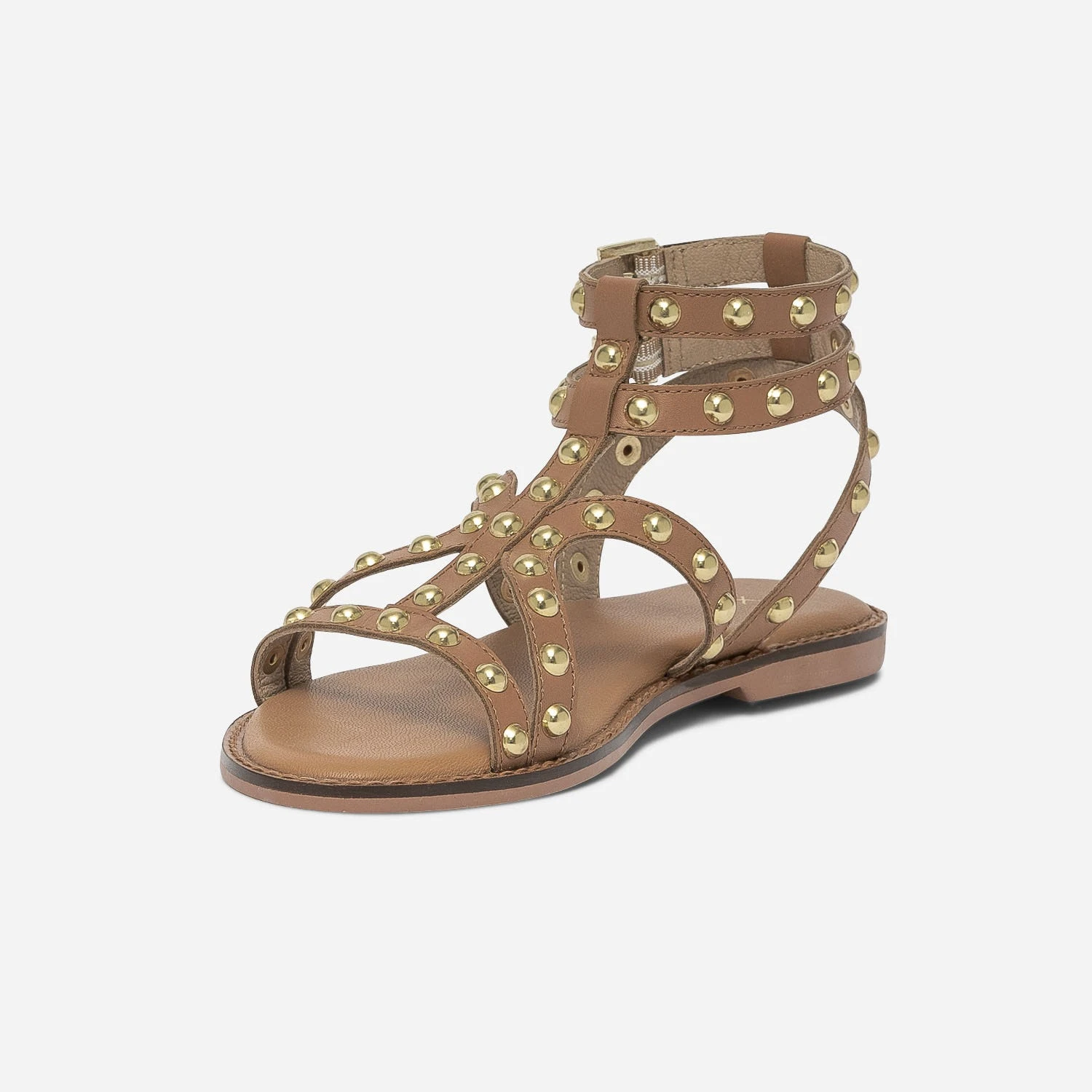 La sandale style spartiate, c’est une des pièces phares de la tendance bohème. En cuir camel, elle déploie ses multiples brides sur tout le pied et se ferme par une double boucle sur la cheville. Elle est décorée de gros clous en métal doré, pour renforcer son côté raffiné. Un modèle à porter avec une robe chemise longue en lin écru à fines rayures marron.