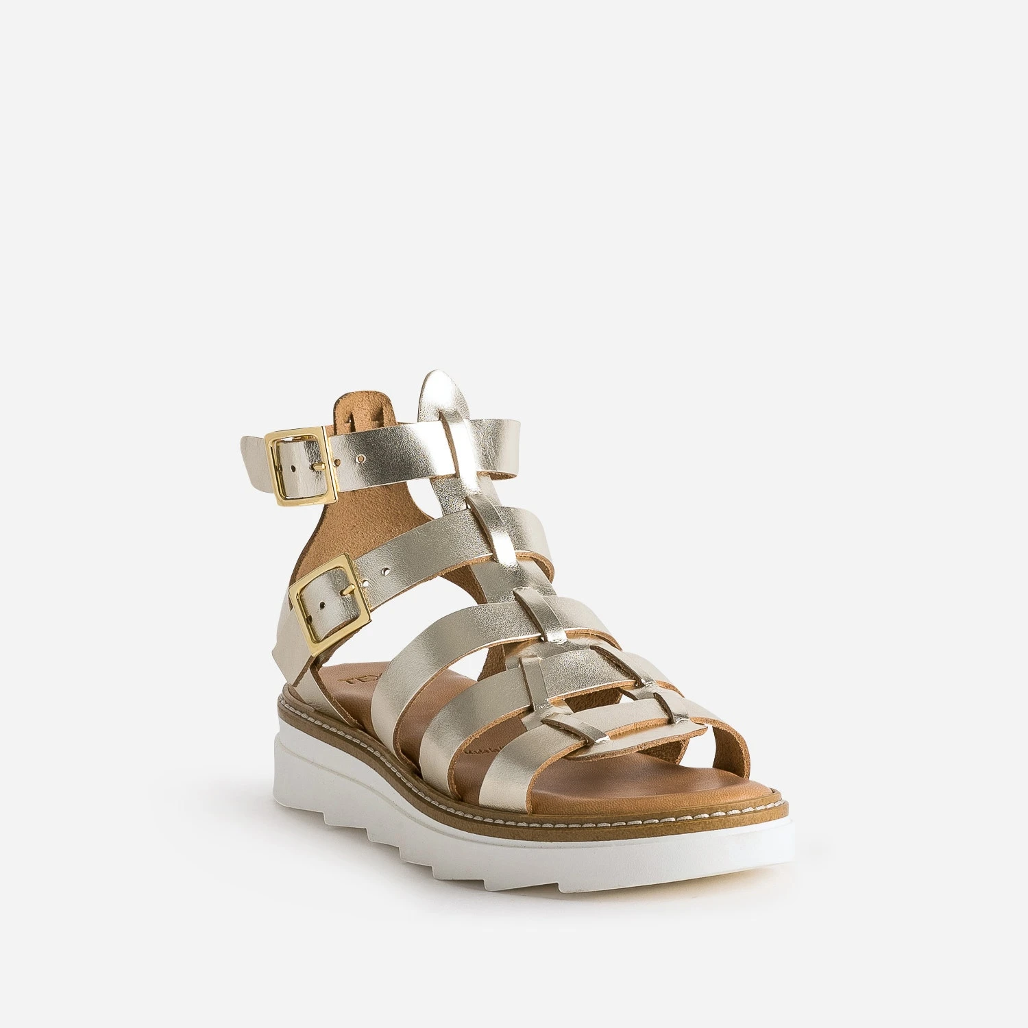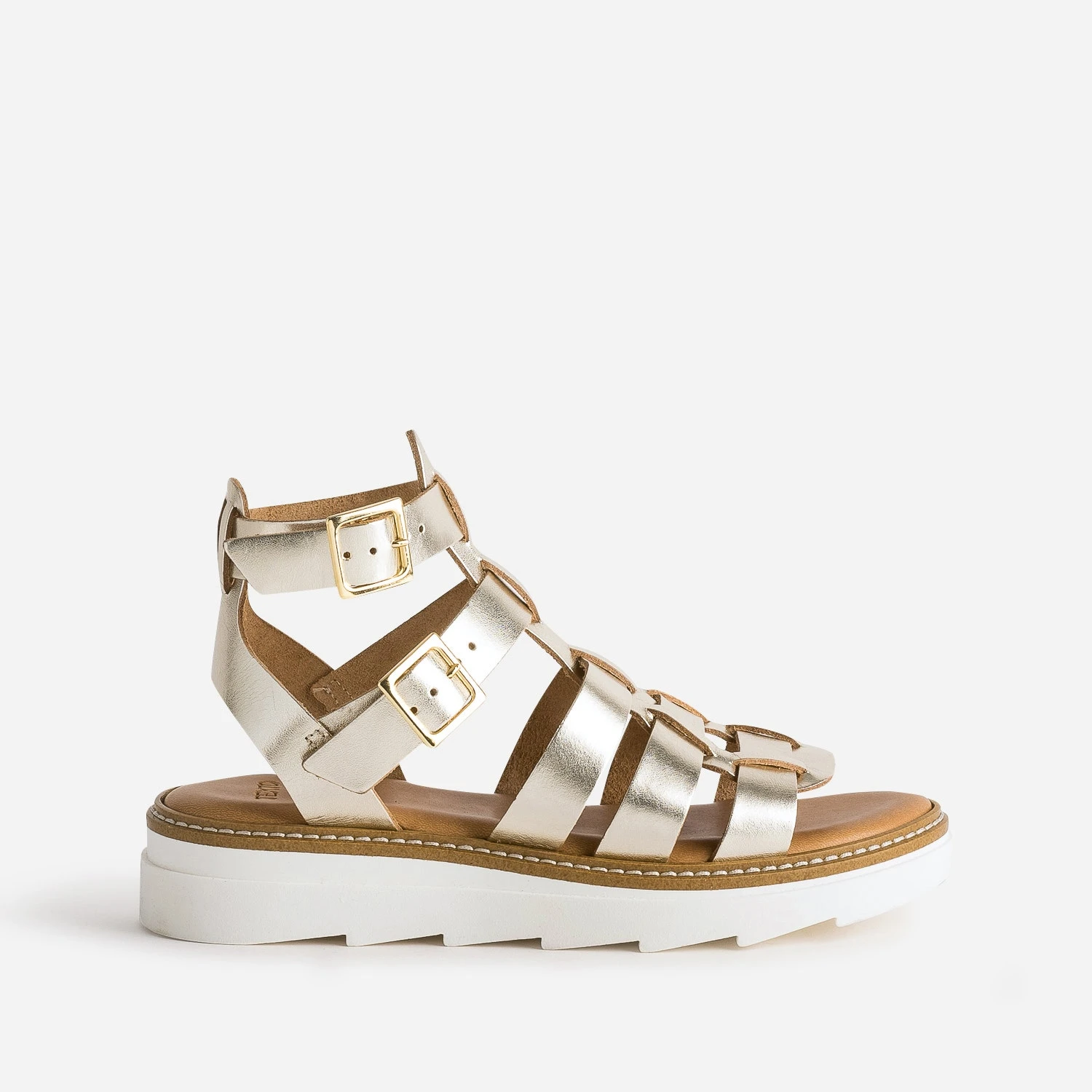 Inspirée par la forme spartiate, reconnaissable à ses multiples brides et sa tige montante, cette sandale pour femme sort du lot. En cuir doré, elle se modernise par une semelle blanche et crantée, pile dans l’air du temps. Un modèle à sortir avec un caraco blanc à fines bretelles et un costume short en lin beige, ou avec une robe tee-shirt oversize tie and dye.