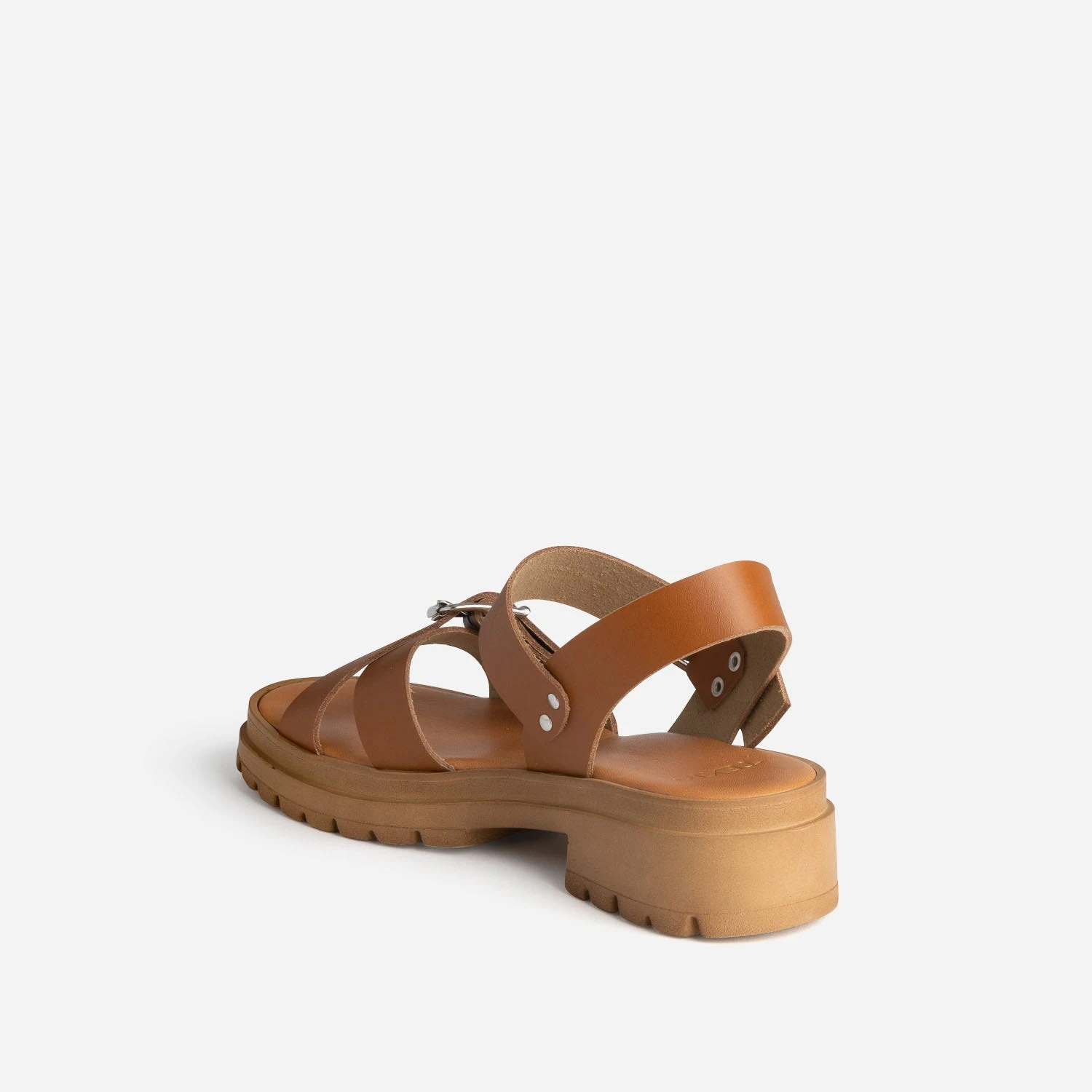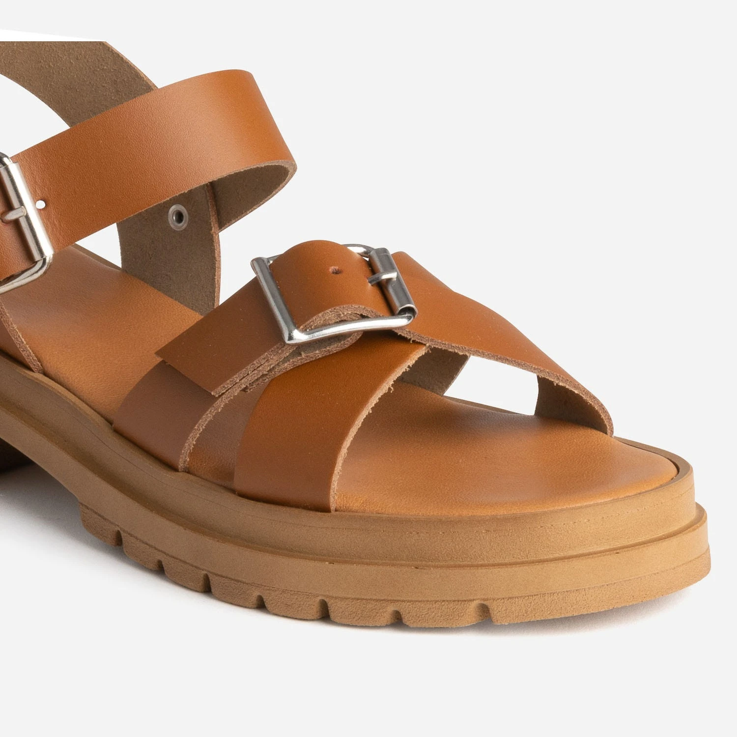 Brides camel, première camel, semelle camel : la sandale pour femme joue le style monochrome à la perfection. En cuir, elle se démarque par de larges brides, dont deux croisées sur le dessus du pied. Toutes fermées par des boucles carrées en métal blanc, pour un maximum de confort. La semelle crantée promet une adhérence optimale sur toutes les surfaces. Avec une robe-chemise en lin kaki, avec un top écru, un pantalon large cropped bleu marine et une veste en jean bleached, elle signe un style décontracté.