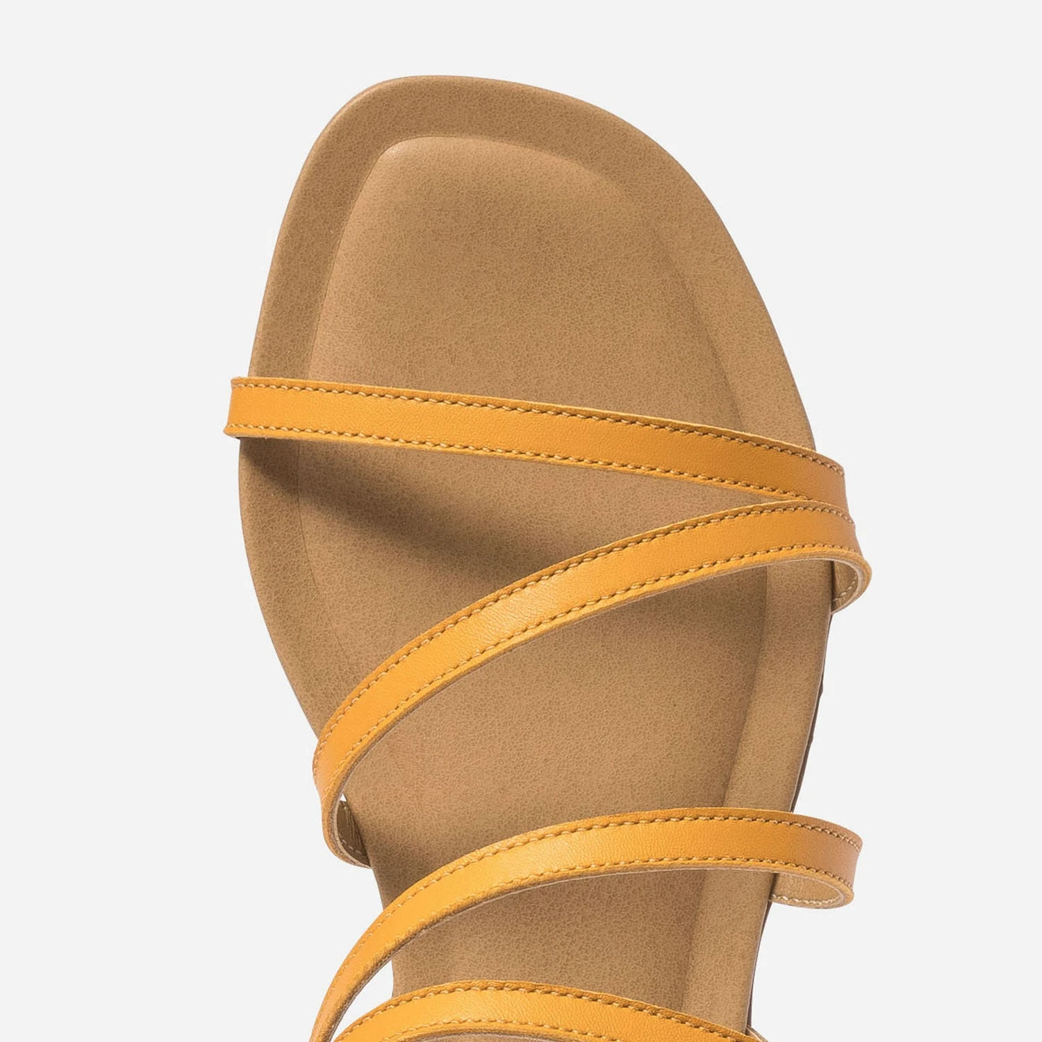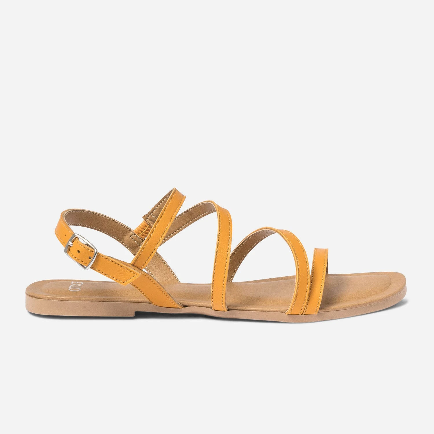 La sandale plate a ses adeptes, notamment au moment des vacances… Toute fine et modernisée par un bout carré, elle se pare de brides en cuir de couleur jaune safran, ajustées par un système d’élastiques discrets. Un modèle ultra facile à glisser dans la valise, pour matcher avec toutes vos tenues.