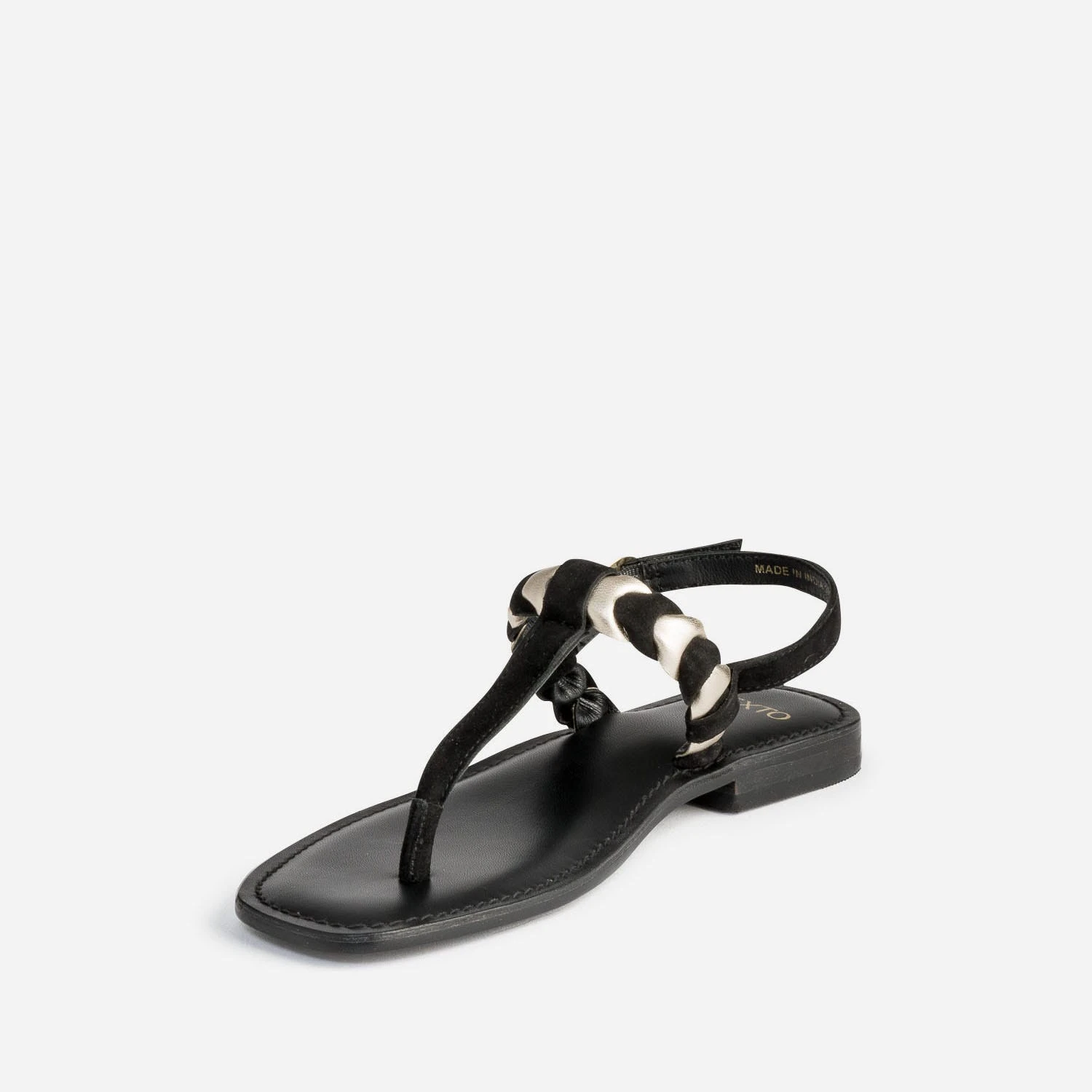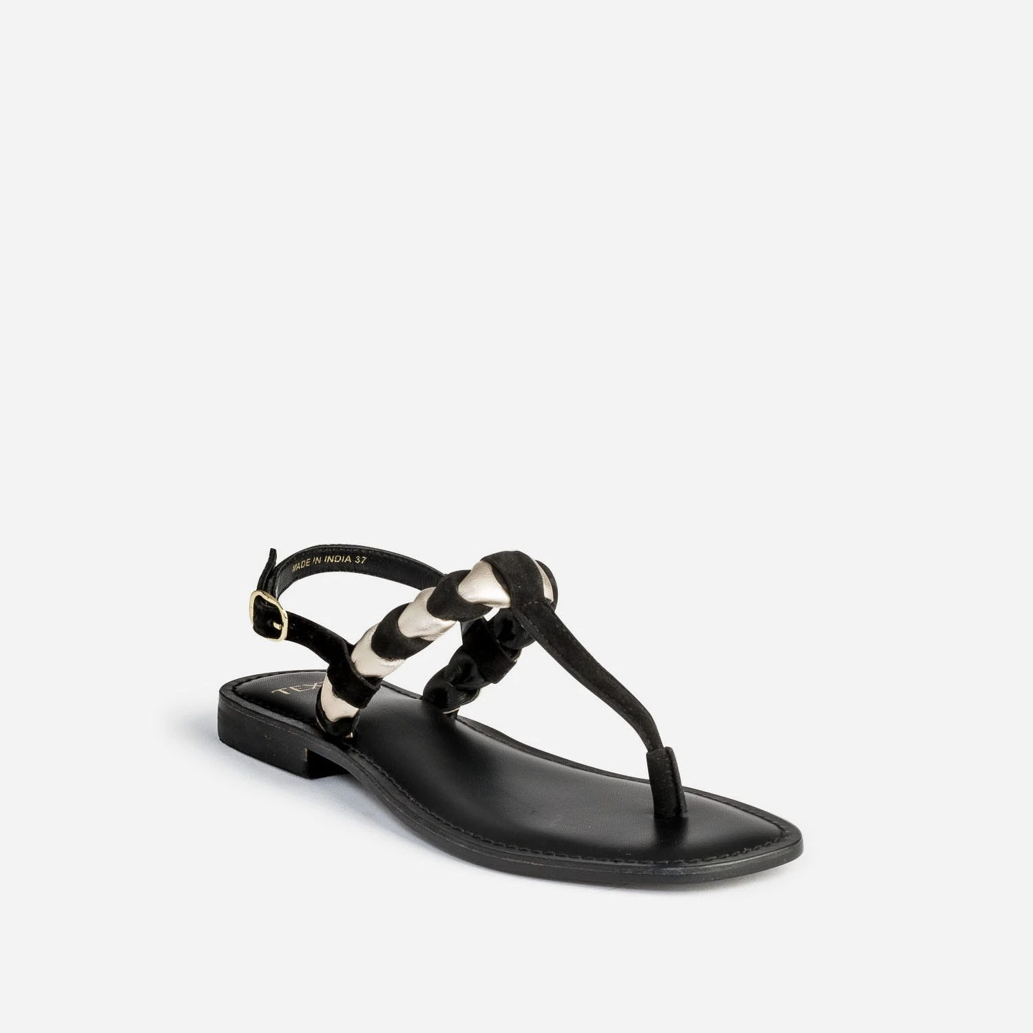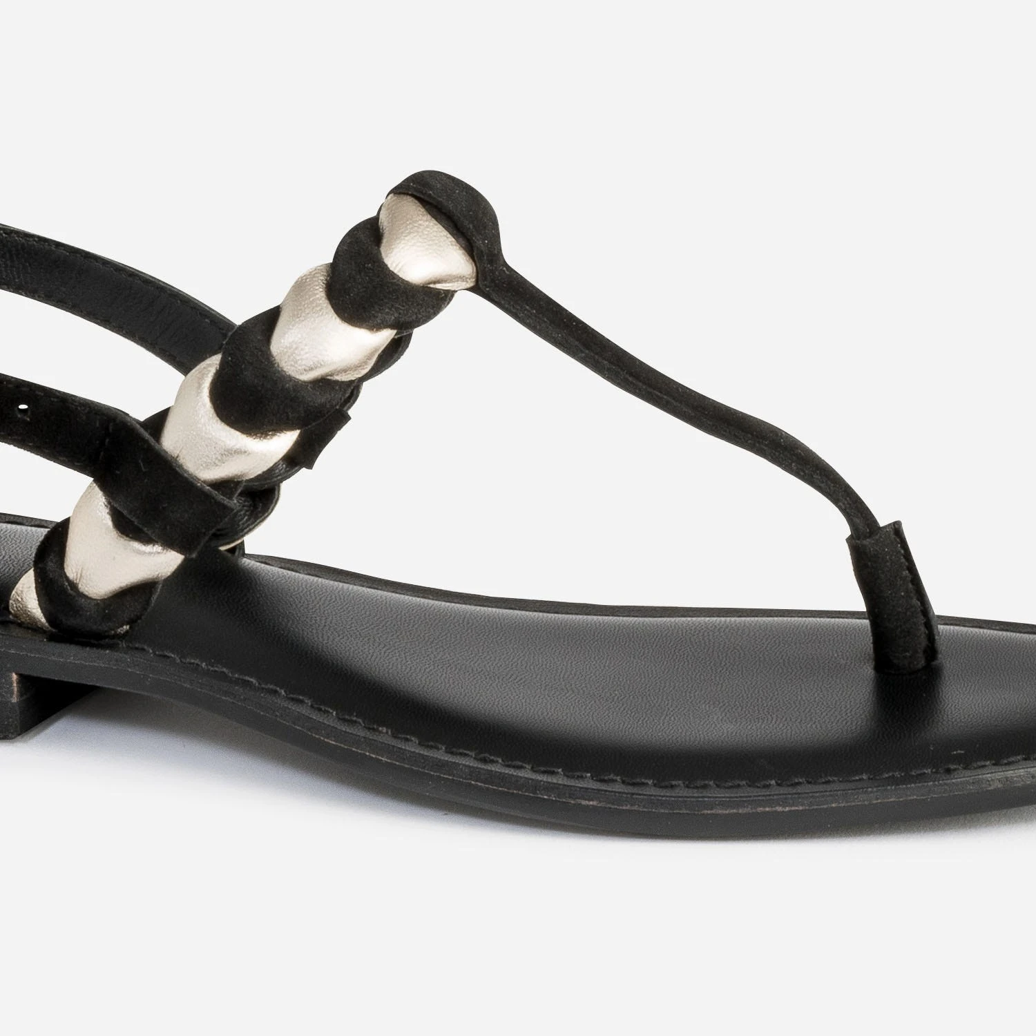 La sandale forme tong met indiscutablement en valeur la finesse du pied. Elle séduit par ses brides en cuir velours noir, avec tressage fantaisie doré. Plate et à bout carré, elle matche avec une robe longue noire, à taille empire et des bijoux dorés.