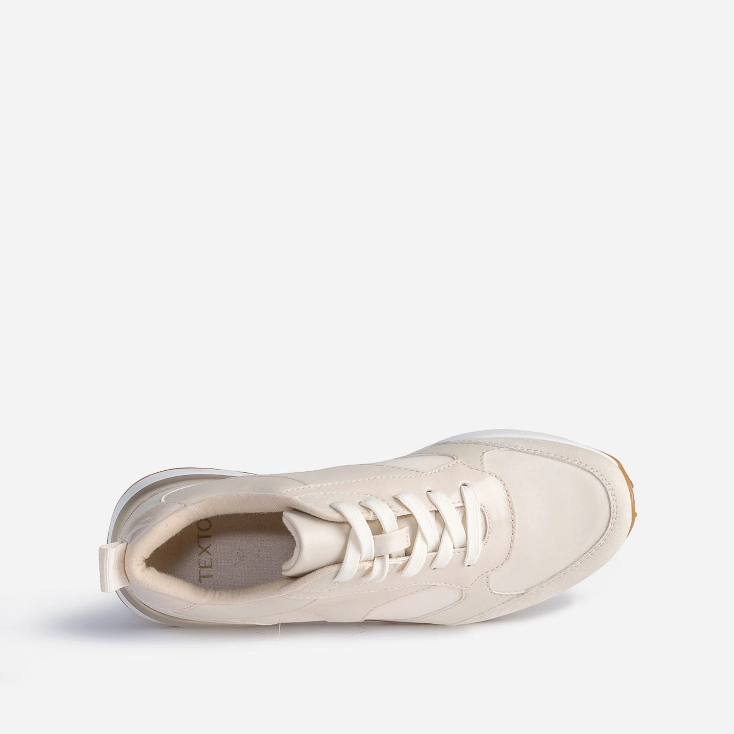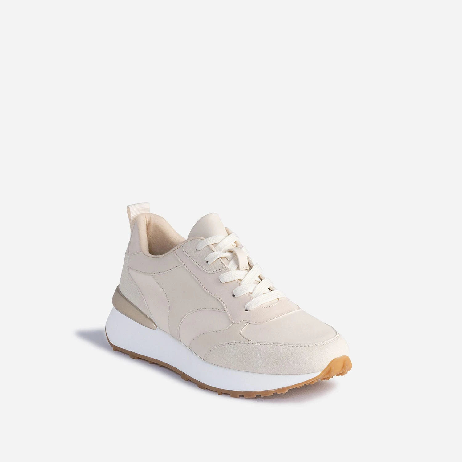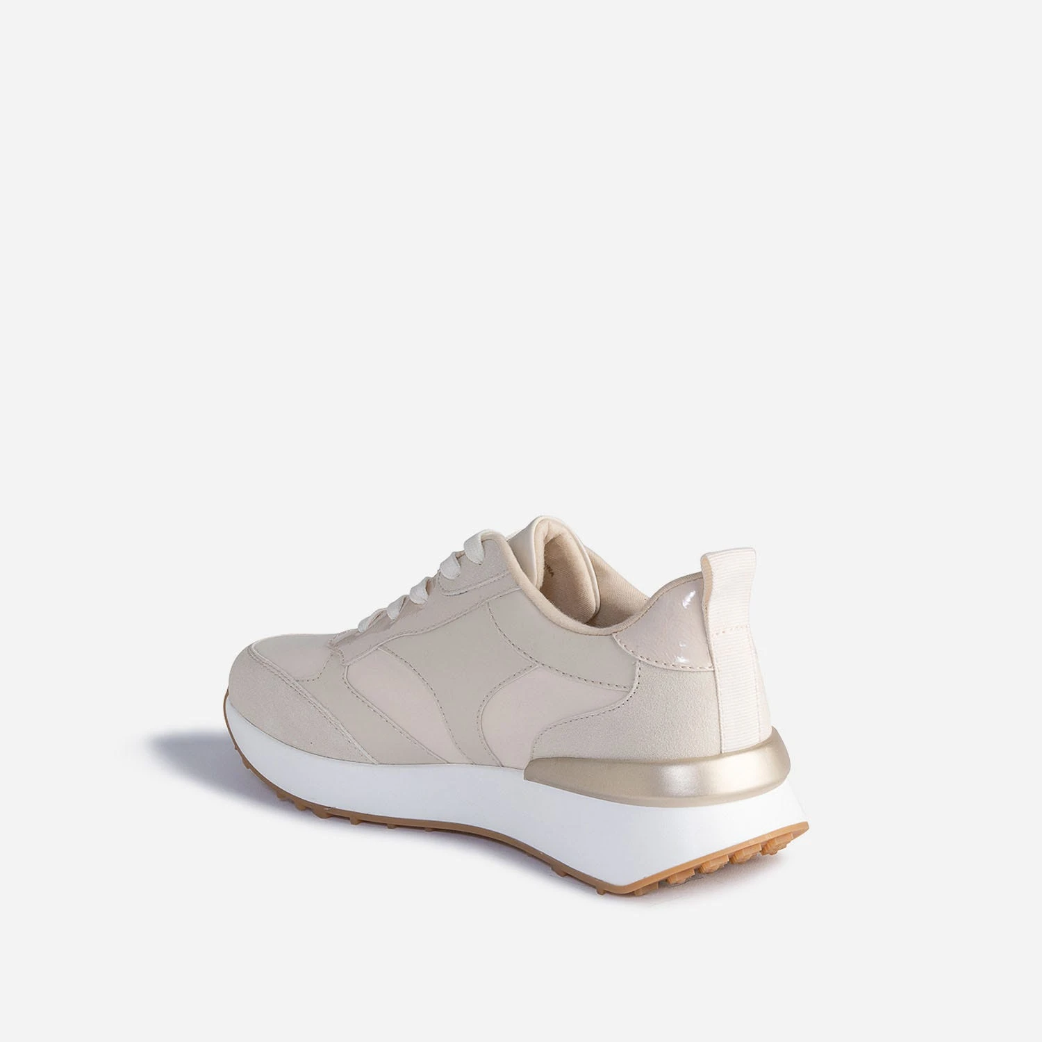 Nude, c’est la couleur dominante de cette tennis pour femme. Mix de matières synthétiques, lisse ou suédée, et de mesh, le tout twisté de détails vernis, elle est montée sur une semelle sport légèrement compensée. Un modèle à privilégier avec une tenue dans les tons naturels, du beige au camel, avec des touches de doré.