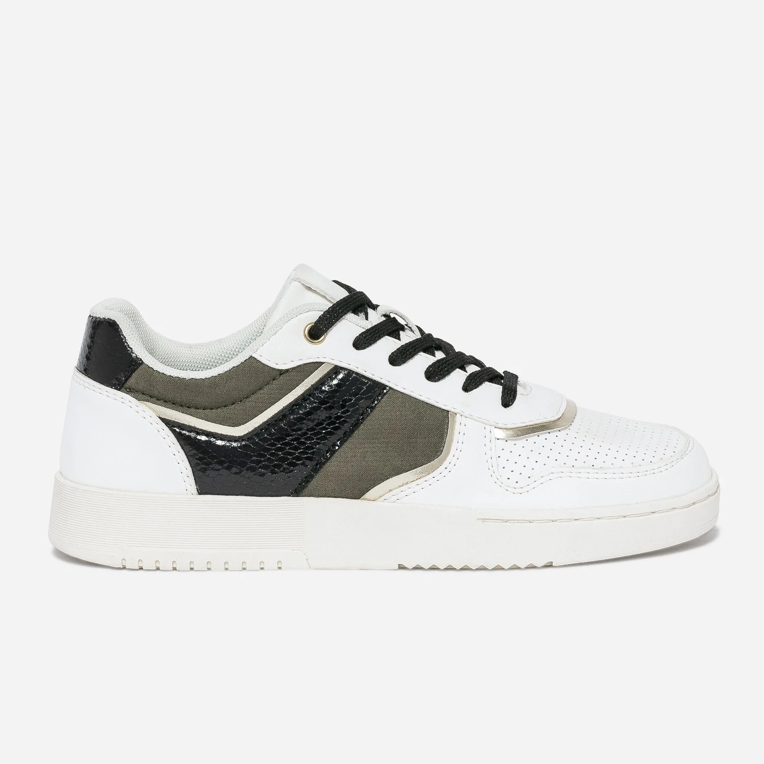 0% de cuir pour cette tennis femme. A dominante blanche, elle est rythmée de touches kaki, noires et dorées, de chaque côté. Le dessus du pied est entièrement perforé, les lacets, pailletés, et les côtés et le contrefort, dévoilent une finition vernie et un effet python. Privilégiez les mêmes coloris, pour votre tenue à tendance sporty.