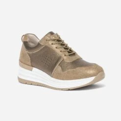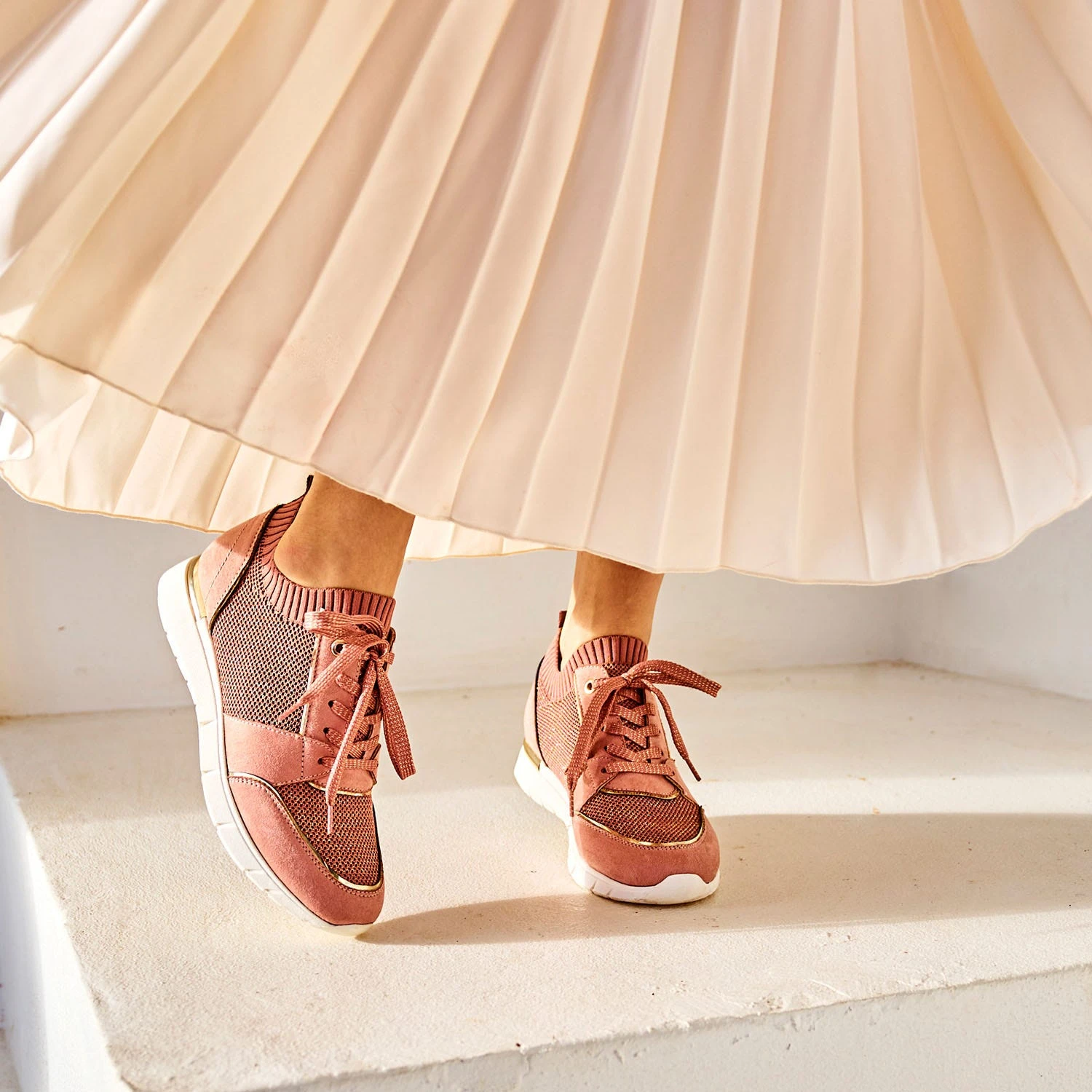 Allure urbaine et contemporaine pour cette tennis vieux rose. Majoritairement en textile tricoté, elle ne présente aucunes coutures et est finalisée par un bord-côte esprit chaussette pour un confort optimal. La semelle sport est décorée d’une baguette dorée, à l’arrière du pied. Sur le dessus, le lacet plat et pailleté s’en fait l’écho. Avec, optez pour un look minimaliste à tendance graphique, avec un sweat blanc à message et un pantalon large beige.